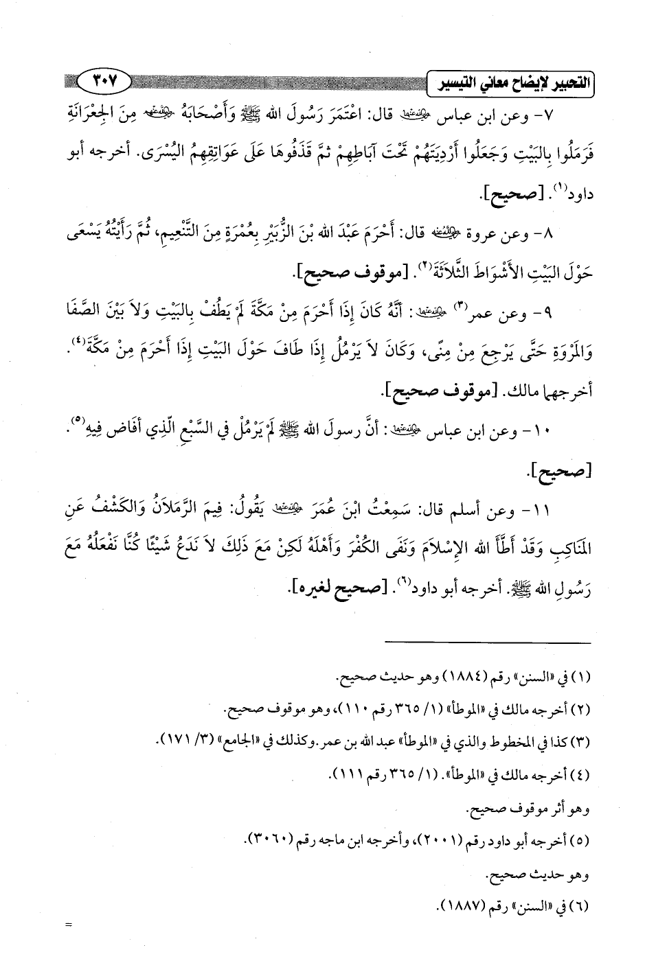 8 - وعن عروة - رضي الله عنه - قال: أَحْرَمَ عَبْدَ الله بْنَ الزُّبَيرِ بِعُمْرَةٍ مِنَ التَّنْعِيمِ، ثُمَّ رَأَيْتُهُ يَسْعَى حَوْلَ البَيْتِ الأَشْوَاطَ الثَّلاَثَةَ (¬2). [موقوف صحيح].