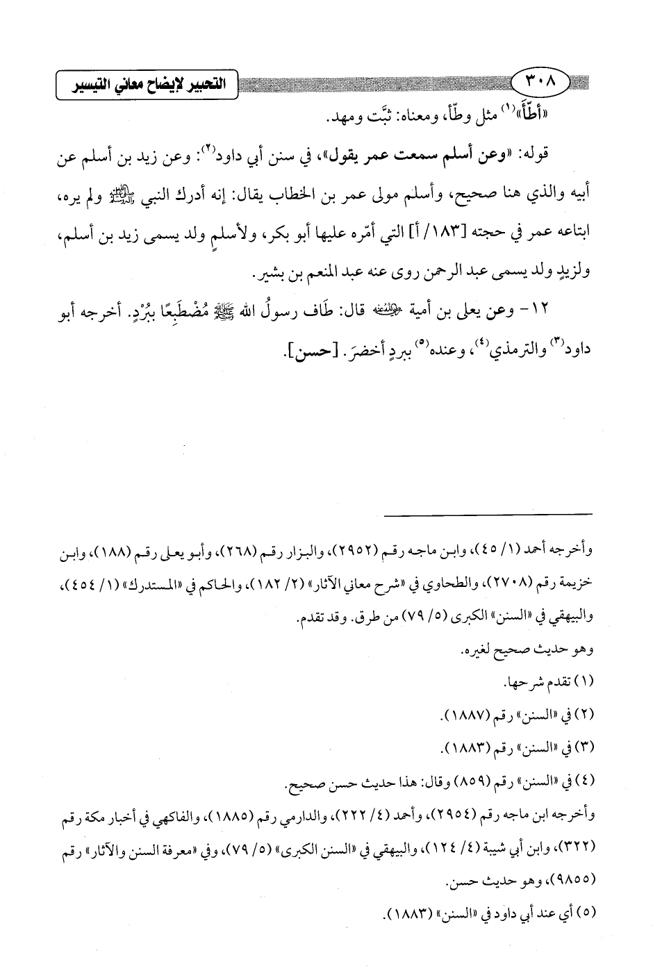 12 - وعن يعلى بن أمية - رضي الله عنه - قال: طَاف رسولُ الله - صلى الله عليه وسلم - مُضْطَبِعًا ببُرْدٍ. أخرجه أبو داود (¬3) والترمذي (¬4)، وعنده (¬5) ببردٍ أخضرَ. [حسن].