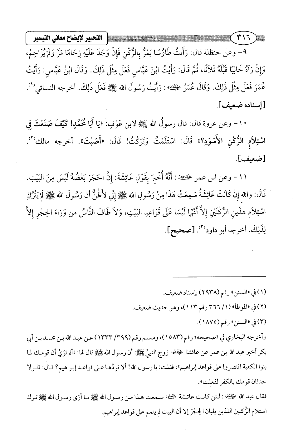 11 - وعن ابن عمر - رضي الله عنهما -: أَنَّهُ أُخْبِرَ بِقَوْلِ عَائِشَةَ: إِنَّ الحَجَرَ بَعْضُهُ لَيْسَ مِنَ البَيْتِ. قَالَ: واللهِ إِنْ كَانَتْ عَائِشَةُ سَمِعَتْ هَذَا مِنْ رَسُولِ الله - صلى الله عليه وسلم - إِنِّي لأَظُنُّ أن رَسُولَ الله - صلى الله عليه وسلم - لَمْ يَتْرُكِ اسْتِلاَم هذَينِ الرُّكْنَيْنِ إِلاَّ أَنَّهُمَا لَيْسَا عَلَى قَوَاعِدِ البَيْتِ، وَلاَ طَافَ النَّاسُ من وَرَاءَ الحِجْرِ إِلاَّ لِذَلِكَ. أخرجه أبو داود (¬3). [صحيح].