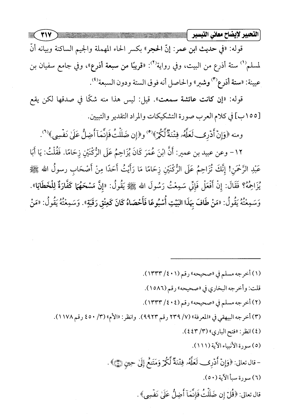 قوله: "في حديث ابن عمر: إنّ الحجر" بكسر الحاء المهملة والجيم الساكنة وبيانه أنّ لمسلم (¬1) ستة أذرع من البيت، وفي رواية (¬2): "قريبًا من سبعة أذرع"، وفي جامع سفيان بن عيينة: "ستة أذرع (¬3) وشبر" والحاصل أنه فوق الستة ودون السبعة (¬4).