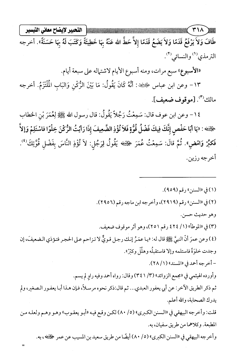 (¬4) وعن عمرَ أنّ النبيَّ - صلى الله عليه وسلم - قال له: "يا عمَرُ إنك رجل قويٌّ لا تزاحم على الحجر فتؤذي الضعيفَ، إن وجدت خلوَةً فاستلمه وإلا فاستقبلُه وهلِّلْ وكبّرْ".