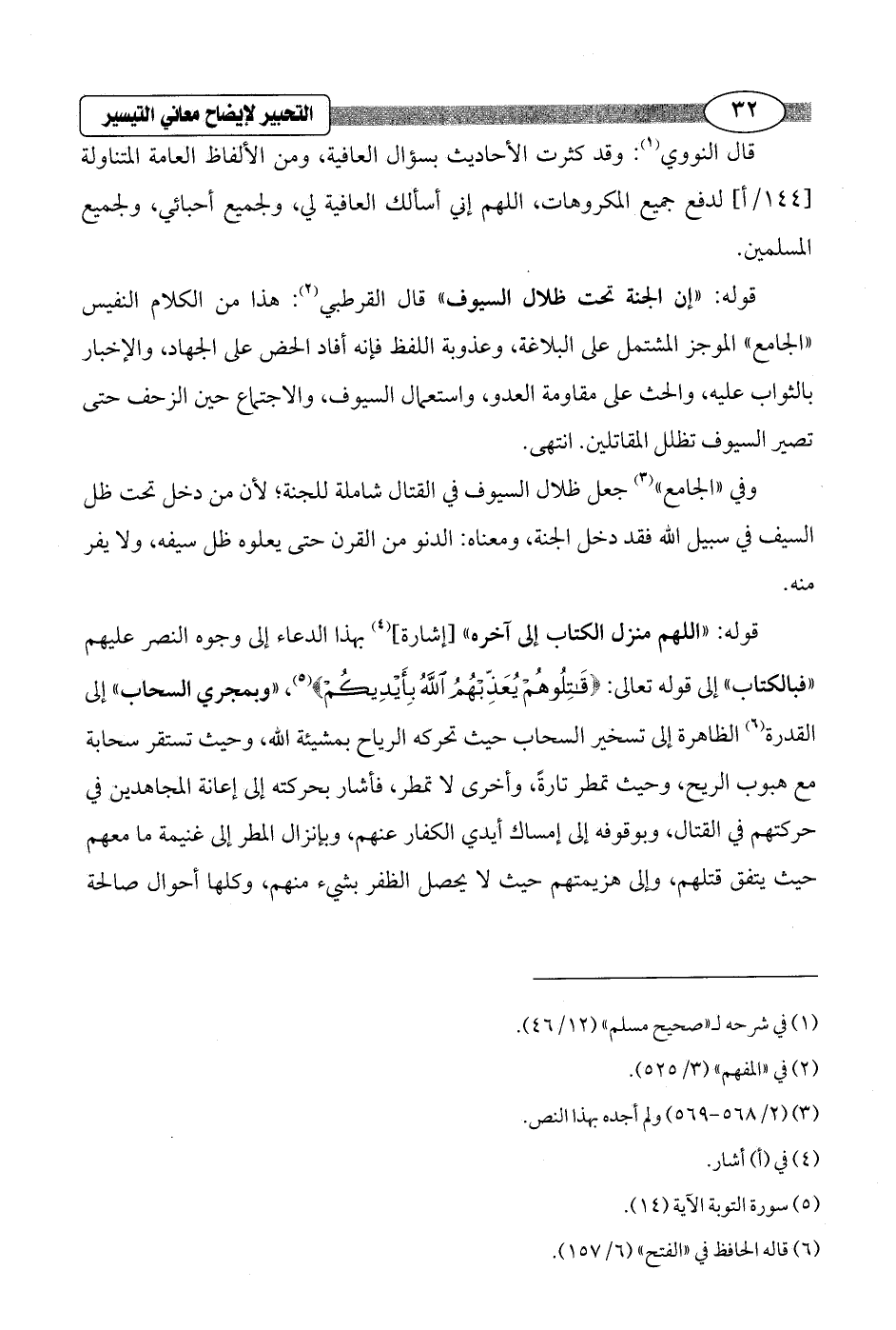 قوله: "اللهم منزل الكتاب إلى آخره" [إشارة] (¬4) بهذا الدعاء إلى وجوه النصر عليهم "فبالكتاب" إلى قوله تعالى: {قَاتِلُوهُمْ يُعَذِّبْهُمُ اللَّهُ بِأَيْدِيكُمْ} (¬5)، "وبمجري السحاب" إلى القدرة (¬6) الظاهرة إلى تسخير السحاب حيث تحركه الرياح بمشيئة الله، وحيث تستقر سحابة مع هبوب الريح، وحيث تمطر تارةً، وأخرى لا تمطر، فأشار بحركته إلى إعانة المجاهدين في حركتهم في القتال، وبوقوفه إلى إمساك أيدي الكفار عنهم، وبإنزال المطر إلى غنيمة ما معهم حيث يتفق قتلهم، وإلى هزيمتهم حيث لا يحصل الظفر بشيء منهم، وكلها أحوال صالحة