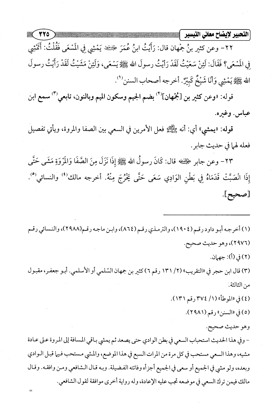 22 - وعن كثير بنُ جمْهان قال: رَأَيْتُ ابنُ عُمَرَ - رضي الله عنهما - يَمشِي في المَسْعَى فَقُلْتُ: أَتَمْشِي في المَسْعَى؟ فَقَالَ: لَئِنْ سَعَيْتُ لَقَدْ رَأيْتُ رسولَ الله - صلى الله عليه وسلم - يَسْعَى، وَلَئِنْ مَشَيْتُ لَقَدْ رَأَيْتُ رسولَ الله - صلى الله عليه وسلم - يَمْشِي وَأنَا شَيْخٌ كَبِيْرٌ. أخرجه أصحاب السنن (¬1).