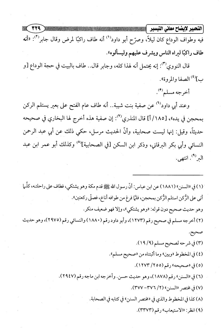 فيه وطواف الوداع كان ليلاً، وصرّح أبو داود (¬1) أنه طاف راكبًا لمرض وقال جابر (¬2): "أنه طاف راكبًا ليراه الناس ويشرف عليهم وليسألوه".