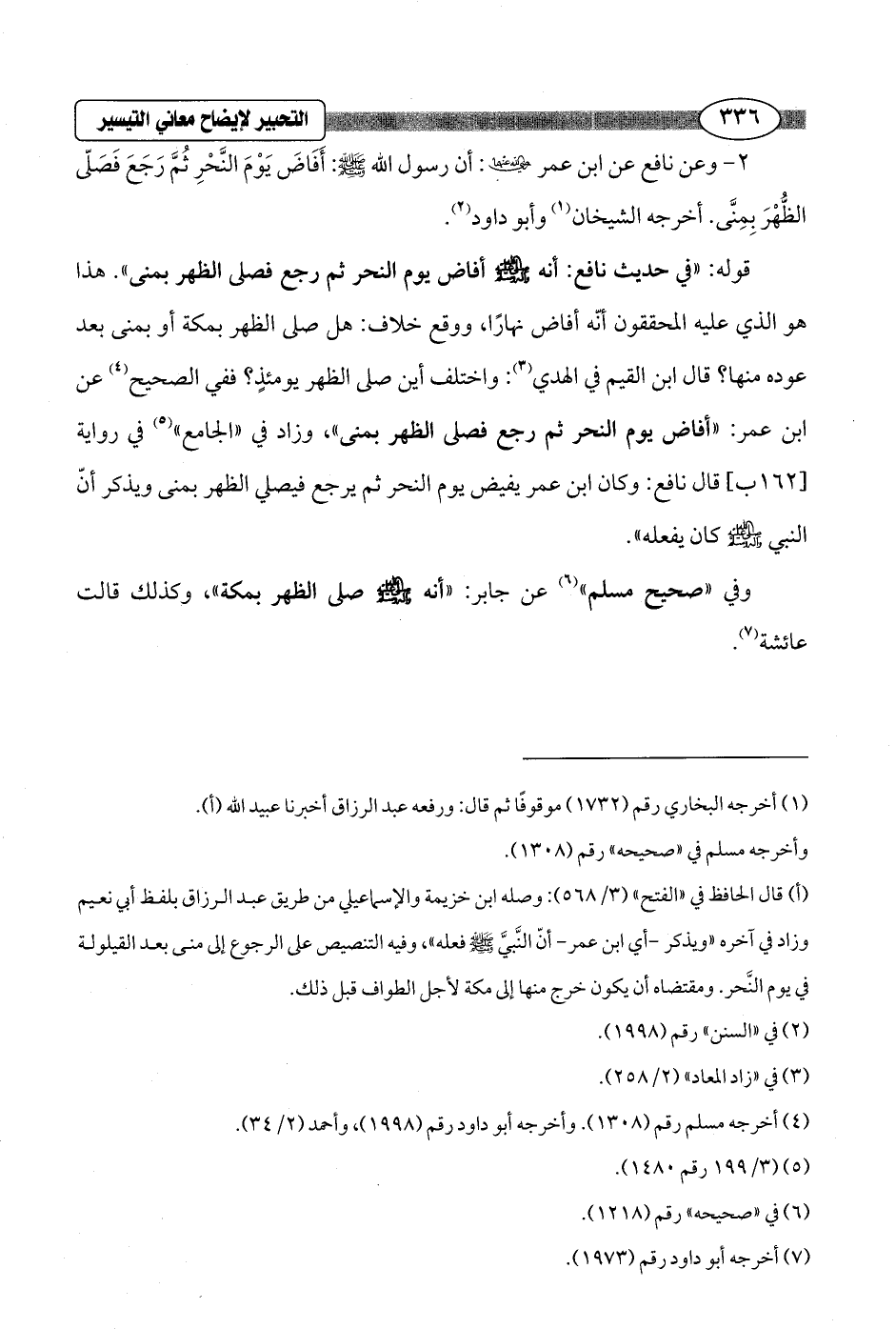 2 - وعن نافع عن ابن عمر - رضي الله عنهما -: أن رسول الله - صلى الله عليه وسلم -: أَفَاضَ يَوْمَ النَّحْرِ ثُمَّ رَجَعَ فَصَلّى الظُّهْرَ بِمِنَّى. أخرجه الشيخان (¬1) وأبو داود (¬2).
