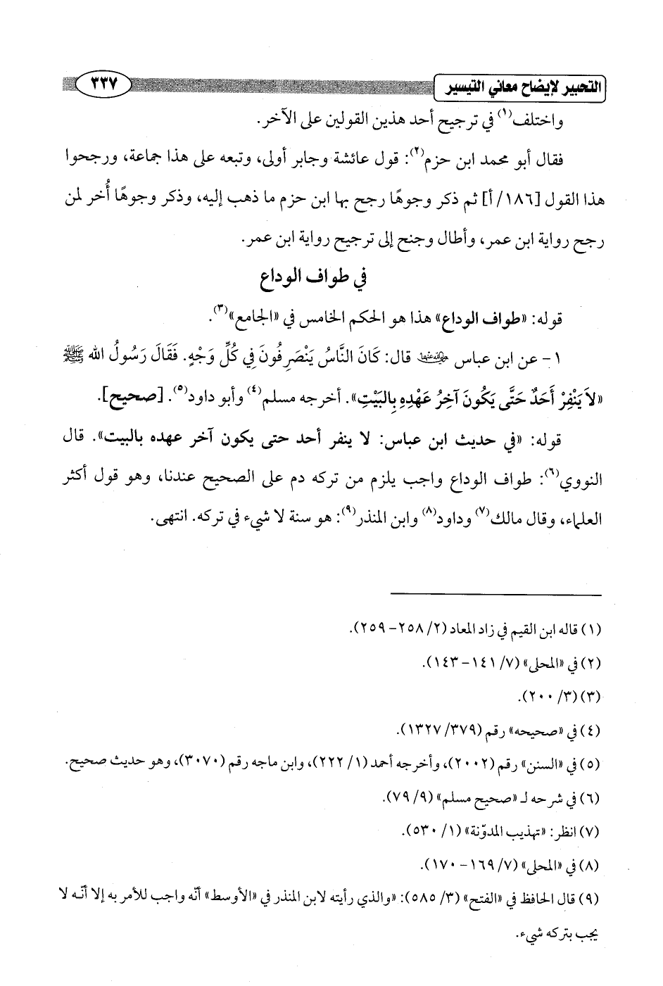 1 - عن ابن عباس - رضي الله عنهما - قال: كَانَ النَّاسُ يَنْصَرِفُونَ في كُلِّ وَجْهٍ. فَقَالَ رَسُولُ الله - صلى الله عليه وسلم - "لاَ يَنْفِرْ أَحَدٌ حَتَّى يَكُونَ آخِرُ عَهْدِهِ بِالبَيْتِ". أخرجه مسلم (¬4) وأبو داود (¬5). [صحيح].