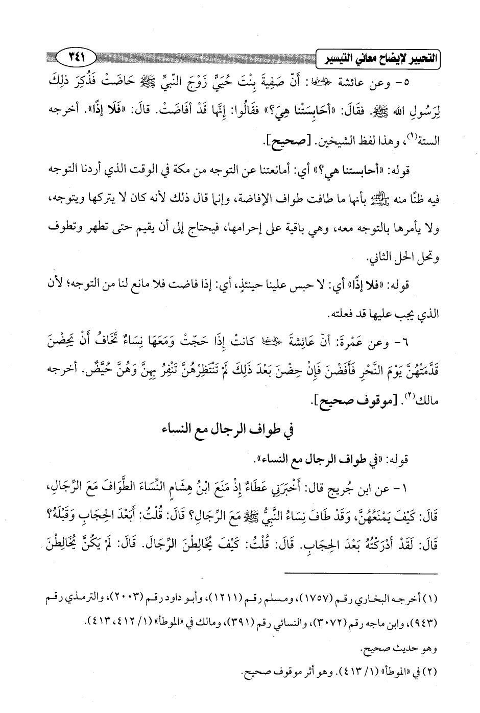 5 - وعن عائشة - رضي الله عنها -: أَنّ صَفِيةَ بِنْتَ حُيَيٍّ زَوْجَ النّبيِّ - صلى الله عليه وسلم - حاضَتْ فَذُكِرَ ذلِكَ لِرَسُولِ الله - صلى الله عليه وسلم -. فقَالَ: "أحَابِسَتْنا هِيَ؟ " فقَالُوا: إِنَّها قَدْ أفَاضَتْ. قَالَ: "فَلَا إذًا". أخرجه الستة (¬1)، وهذا لفظ الشيخين. [صحيح].