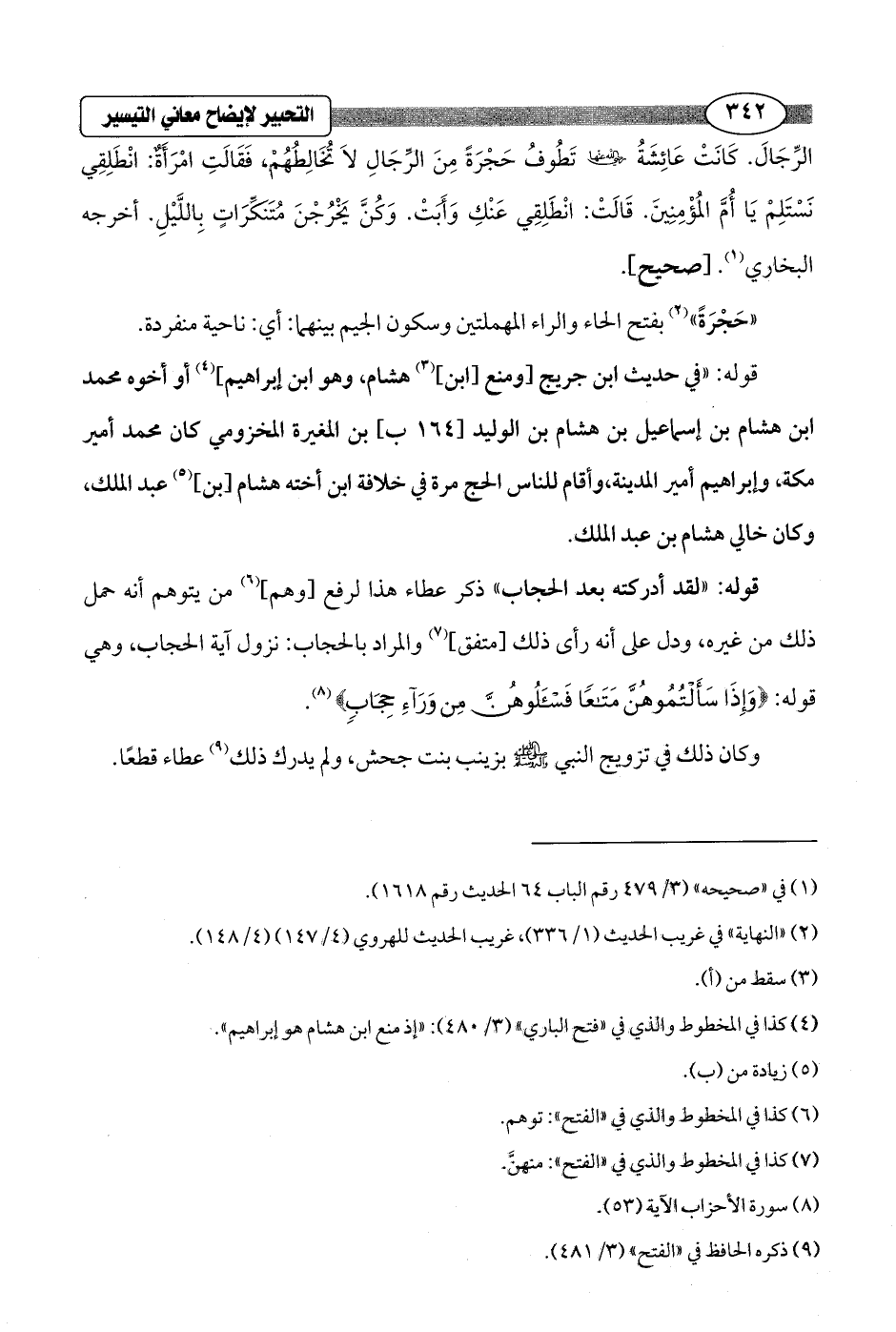 قوله: "لقد أدركته بعد الحجاب" ذكر عطاء هذا لرفع [وهم] (¬6) من يتوهم أنه حمل ذلك من غيره، ودل على أنه رأى ذلك [متفق] (¬7) والمراد بالحجاب: نزول آية الحجاب، وهي قوله: {وَإِذَا سَأَلْتُمُوهُنَّ مَتَاعًا فَاسْأَلُوهُنَّ مِنْ وَرَاءِ حِجَابٍ} (¬8).