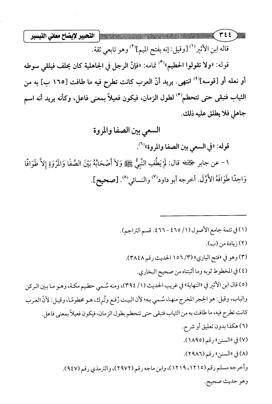 1 - عن جابر - رضي الله عنه - قال: لَمْ يَطُفِ النَّبِيُّ - صلى الله عليه وسلم - وَلاَ أَصْحَابُهُ بَيْنَ الصَّفَا وَالمَرْوةِ إِلاَّ طَوَافًا وَاحِدًا طَوَافَهُ الأَوَّلَ. أخرجه أبو داود (¬7) والنسائي (¬8). [صحيح].