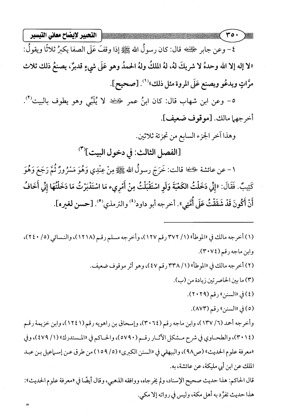 1 - عن عائشة - رضي الله عنها - قالت: خَرَجَ رسولُ الله - صلى الله عليه وسلم - مِنْ عِنْدِي وَهُوَ مَسْرُورٌ ثُمَّ رَجَعَ وَهُوَ كَئِيبٌ. فَقَالَ: "إِنِّي دَخَلْتُ الكَعْبَةَ وَلَوِ اسْتَقْبَلْتُ مِنْ أَمْرِيء مَا اسْتَدْبَرْتُ مَا دَخَلْتُهَا إِنِّي أَخَافُ أَنْ أَكُونَ قَدْ شَقَقْتُ عَلَى أُمَّتِي". أخرجه أبو داود (¬4) والترمذي (¬5). [حسن لغيره].