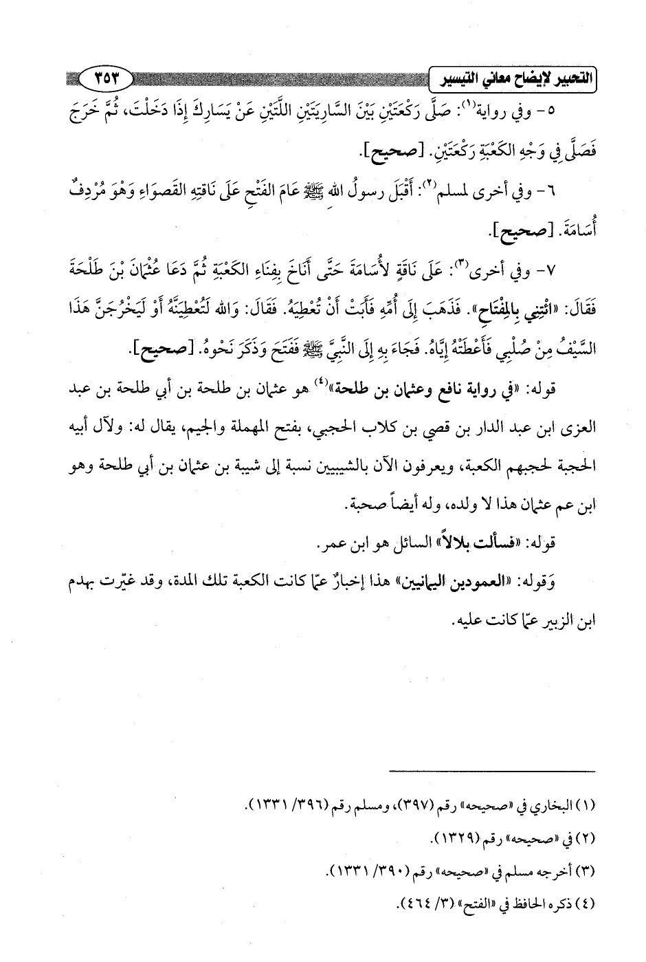 قوله: "في رواية نافع وعثمان بن طلحة" (¬4) هو عثمان بن طلحة بن أبي طلحة بن عبد العزى ابن عبد الدار بن قصي بن كلاب الحجبي، بفتح المهملة والجيم، يقال له: ولآل أبيه الحجبة لحجبهم الكعبة, ويعرفون الآن بالشيبيين نسبة إلى شيبة بن عثمان بن أبي طلحة وهو ابن عم عثمان هذا لا ولده, وله أيضاً صحبة.