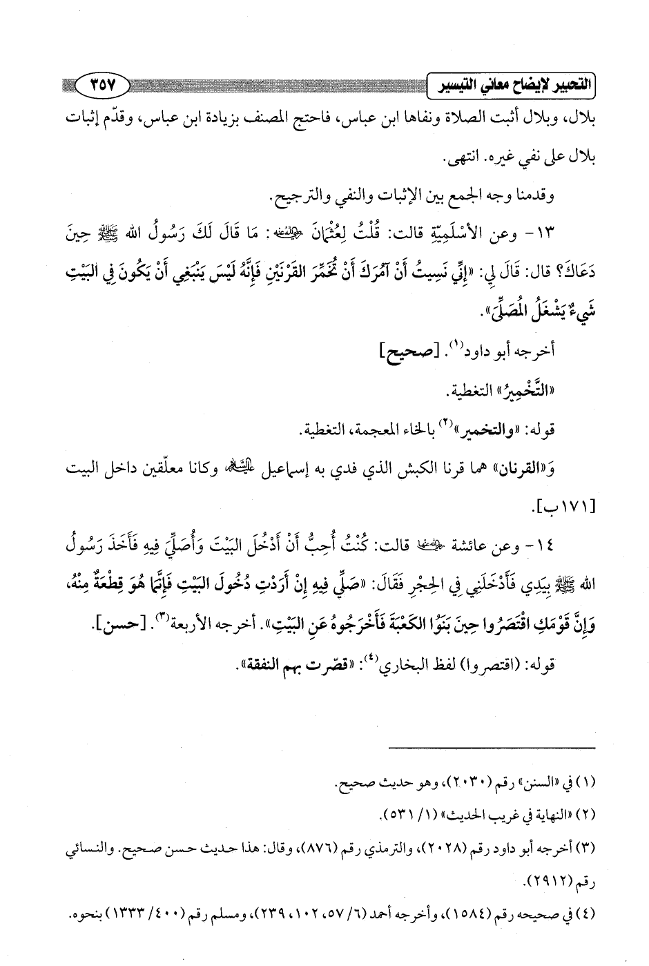14 - وعن عائشة - رضي الله عنها - قالت: كُنْتُ أُحِبُّ أَنْ أَدْخُلَ البَيْتَ وَأُصَلِّيَ فِيهِ فَأَخَذَ رَسُولُ الله - صلى الله عليه وسلم - بِيَدِي فَأَدْخَلَنِي فِي الحِجْرِ فَقَالَ: "صَلِّي فِيهِ إِنْ أَرَدْتِ دُخُولَ البَيْتِ فَإِنَّمَا هُوَ قِطْعَةٌ مِنْهٌ, وإِنَّ قَوْمَكِ اقْتَصَرُوا حِينَ بَنَوُا الكَعْبَةَ فَأَخْرَجُوهُ عَنِ البَيْتِ". أخرجه الأربعة (¬3). [حسن].