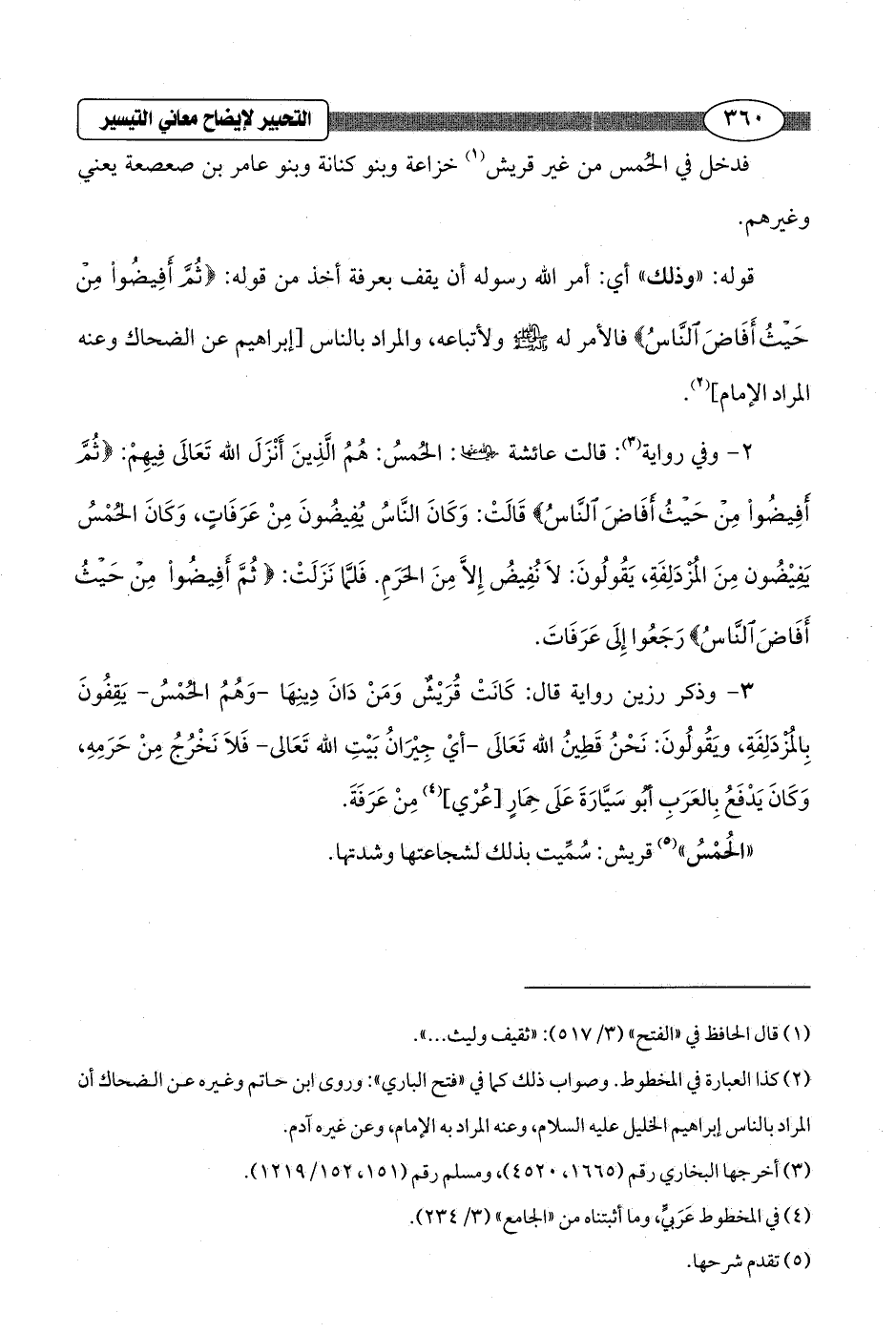 2 - وفي رواية (¬3): قالت عائشة - رضي الله عنها -: الحُمسُ: هُمُ الَّذِينَ أَنْزَلَ الله تَعَالَى فِيهِمْ: {ثُمَّ أَفِيضُوا مِنْ حَيْثُ أَفَاضَ النَّاسُ} قَالَتْ: وَكَانَ النَّاس يُفِيضُونَ مِنْ عَرَفَاتٍ، وَكَانَ الحُمْسُ يَفيْضُون مِنَ المْزدَلِفَةِ، يَقُوُلونَ: لاَ نُفِيضُ إِلاَّ مِنَ الحَرَمِ. فَلمَّا نَزَلَتْ: {ثُمَّ أَفِيضُوا مِنْ حَيْثُ أَفَاضَ النَّاسُ} رَجَعُوا إِلَى عَرَفَاتَ.