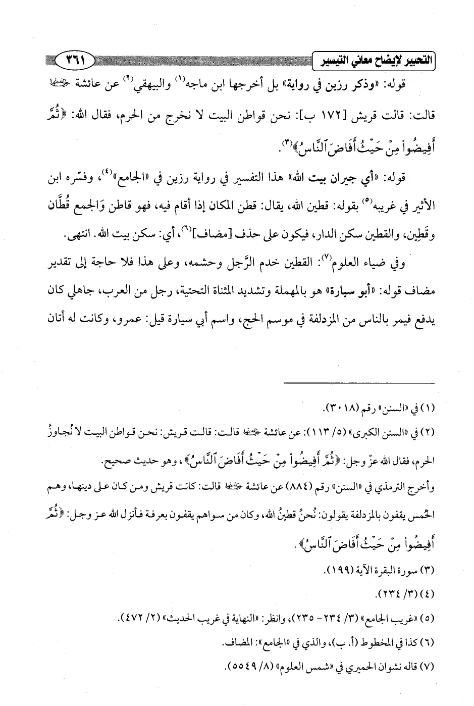 (¬2) في "السنن الكبرى" (5/ 113): عن عائشة - رضي الله عنها - فالت: قالت قريش: نحن قواطن البيت لا نُجاوزُ الحرم، فقال الله عزّ وجل: {ثُمَّ أَفِيضُوا مِنْ حَيْثُ أَفَاضَ النَّاسُ} , وهو حديث صحيح.