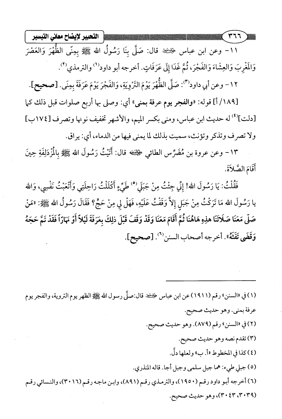 (¬1) في "السنن" رقم (1911) عن ابن عباس - رضي الله عنهما - قال: صلَّى رسول الله - صلى الله عليه وسلم - الظهر يوم التروية, والفجر يوم عرفة بمنى. وهو حديث صحيح.