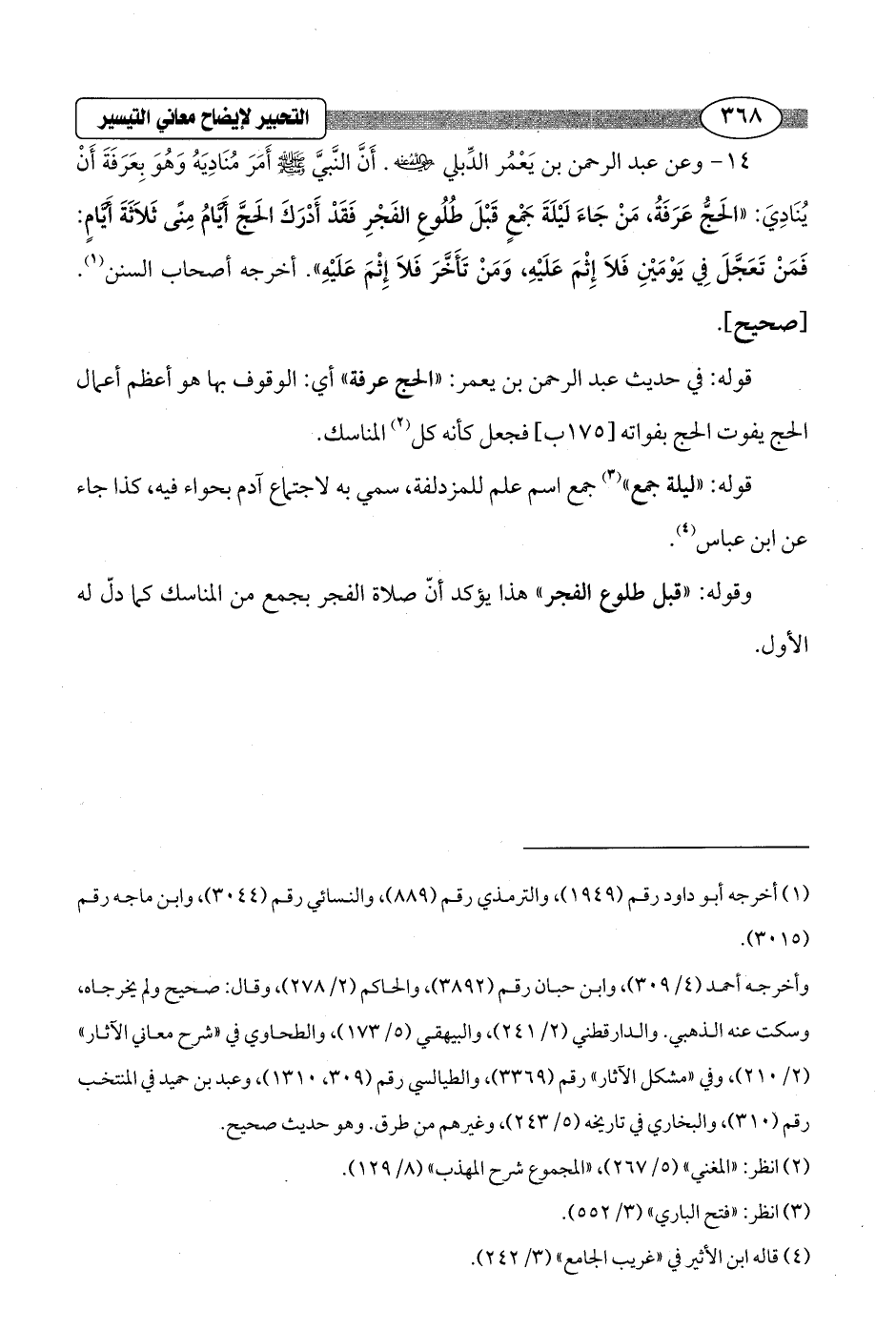 14 - وعن عبد الرحمن بن يَعْمُر الدِّبلي - رضي الله عنه -. أَنَّ النَّبيَّ - صلى الله عليه وسلم - أَمَرَ مُنَادِيَهُ وَهُوَ بِعَرَفَةَ أَنْ يُنَادِيَ: "الحَجُّ عَرَفَةُ، مَنْ جَاءَ لَيْلَةَ جَمْعٍ قَبْلَ طُلُوعِ الفَجْرِ فَقَدْ أدْرَكَ الحَجَّ أَيَّامُ مِنًى ثَلاَثَةَ أَيَّامٍ: فَمَنْ تَعَجَّلَ فِي يَوْمَيْنِ فَلاَ إِثْمَ عَلَيه، وَمَنْ تَأَخَّرَ فَلاَ إِثْمَ عَلَيْهِ". أخرجه أصحاب السنن (¬1). [صحيح].