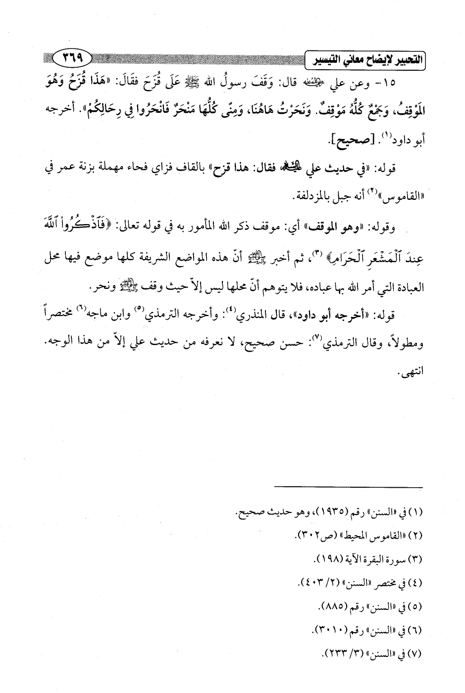15 - وعن علي - رضي الله عنه - قال: وَقَفَ رسولُ الله - صلى الله عليه وسلم - عَلَى قُزَحَ فقَالَ: "هَذَا قُزَحُ وَهُوَ المَوْقِفُ، وَجَمْعٌ كُلُّهُ مَوْقِفٌ. وَنَحَرْتُ هَاهُنَا، وَمِنًى كلُّهَا مَنْحَرٌ فَانْحَرُوا فِي رِحَالِكُمْ". أخرجه أبو داود (¬1). [صحيح].