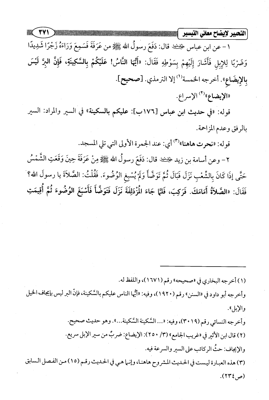 1 - عن ابن عباس - رضي الله عنهما - قال: دَفَعَ رسولُ الله - صلى الله عليه وسلم - من عَرَفَةَ فَسَمِعَ وَرَاءَهُ زَجْرًا شَدِيدًا وَضَرْبًا لِلإِبِلِ فَأَشَارَ إِلَيْهِمْ بِسَوْطِهِ فَقَالَ: "أَيُّهَا النَّاسُ! عَلَيْكُمْ بِالسَّكِينَةِ، فَإِنَّ الِبرَّ لَيْسَ بِالإِيضَاعِ". أخرجه الخمسة (¬1) إلا الترمذي. [صحيح].
