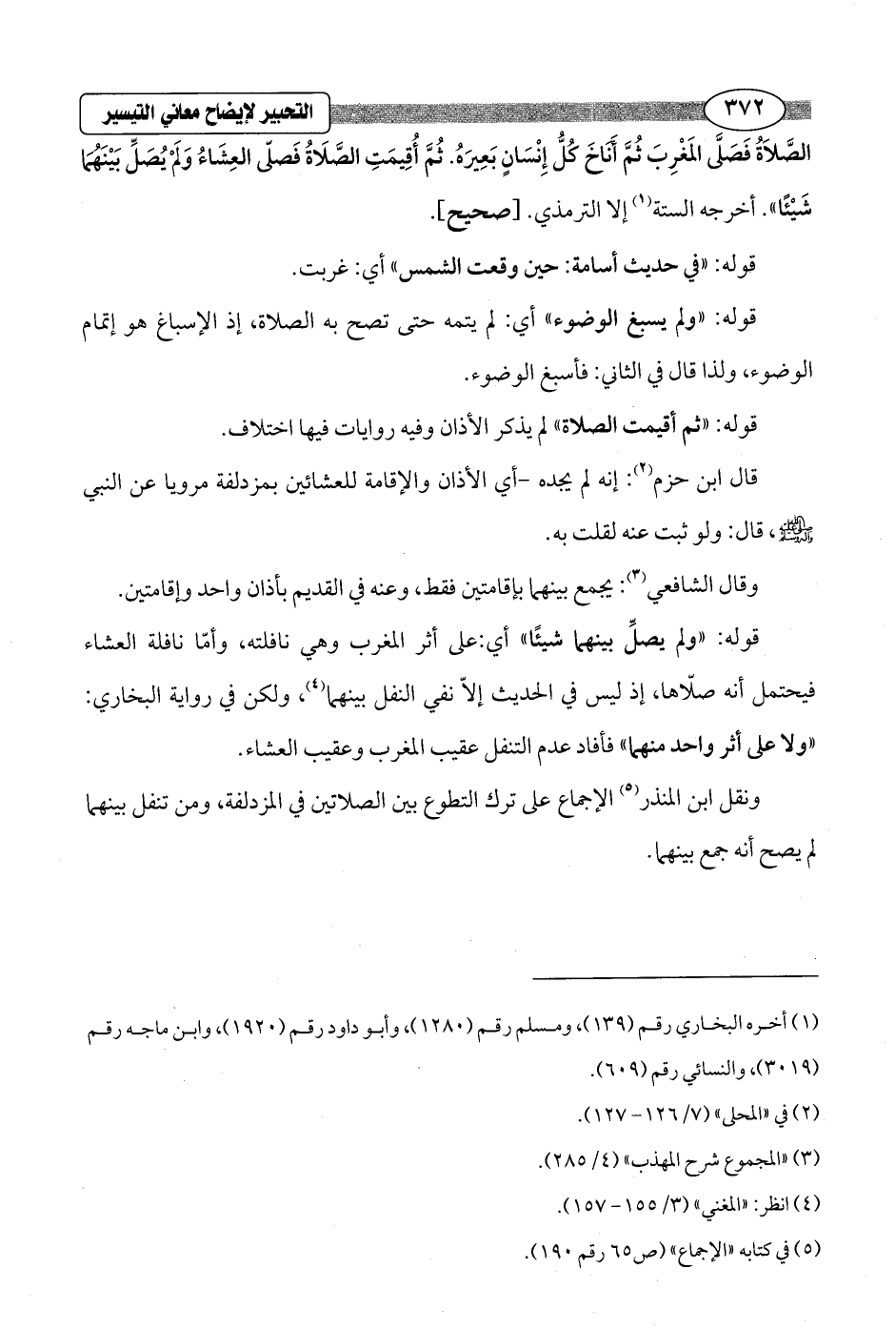 الصَّلاَةُ فَصَلَّى المَغْرِبَ ثُمَّ أَنَاخَ كُلُّ إِنْسَانٍ بَعِيرَهُ. ثُمَّ أُقِيمَتِ الصَّلَاةُ فَصلّى العِشَاءُ ولم يُصَلِّ بَيْنَهُمَا شَيْئًا". أخرجه الستة (¬1) إلا الترمذي. [صحيح].