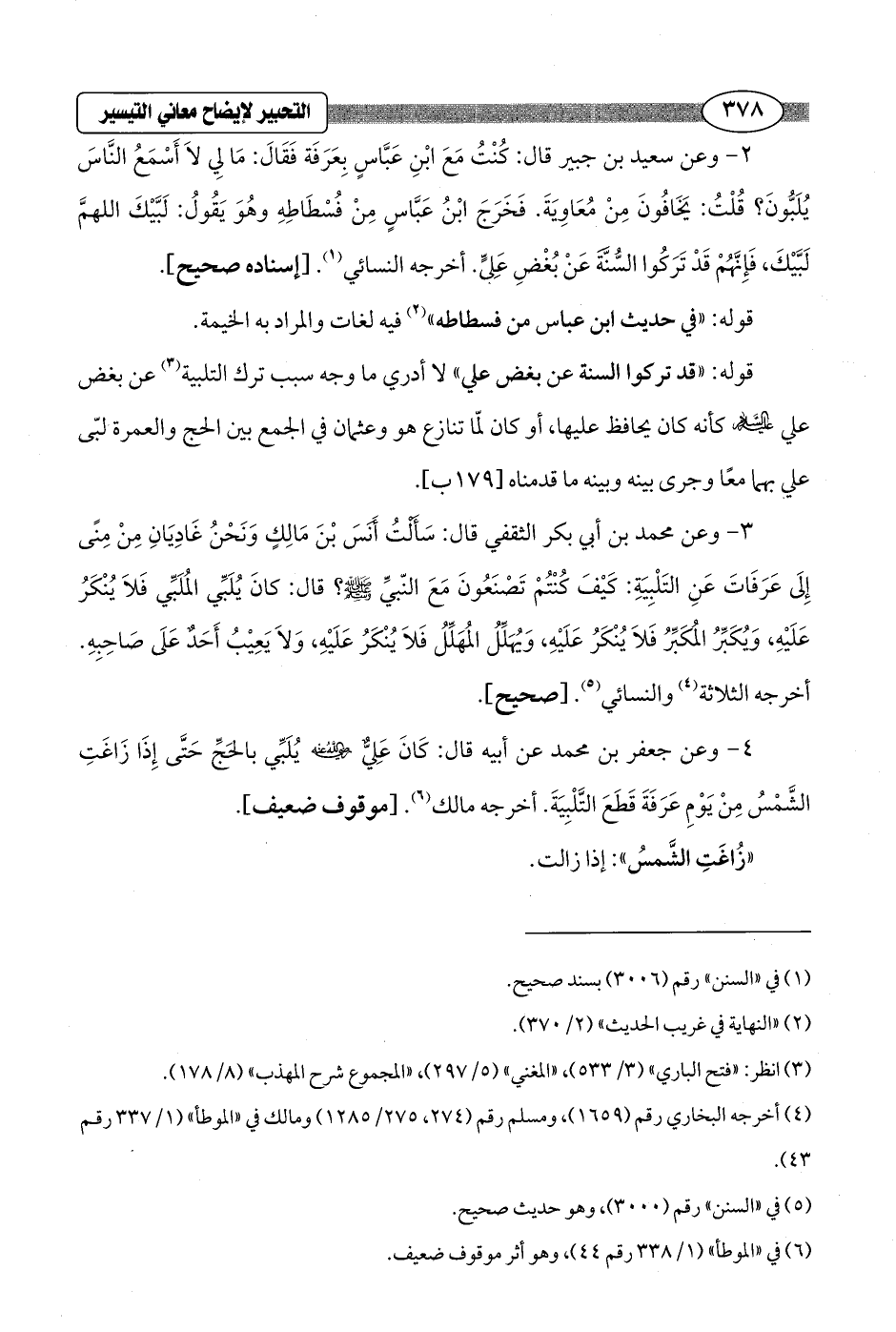 2 - وعن سعيد بن جبير قال: كُنْتُ مَعَ ابْنِ عَبَّاسٍ بِعَرَفَة فَقَالَ: مَا لِي لاَ أَسْمَعُ النَّاسَ يُلَبُّونَ؟ قُلْتُ: يَخَافُونَ مِنْ مُعَاوِيَةَ. فَخَرَجَ ابْنُ عَبَّاسٍ مِنْ فُسْطَاطِهِ وهُوَ يَقُولُ: لَبَّيْكَ اللهمَّ لَبَّيْكَ، فَإِنَّهُمْ قَدْ تَرَكُوا السُّنَّةَ عَنْ بُغْضِ عَلِيٍّ. أخرجه النسائي (¬1). [إسناده صحيح].