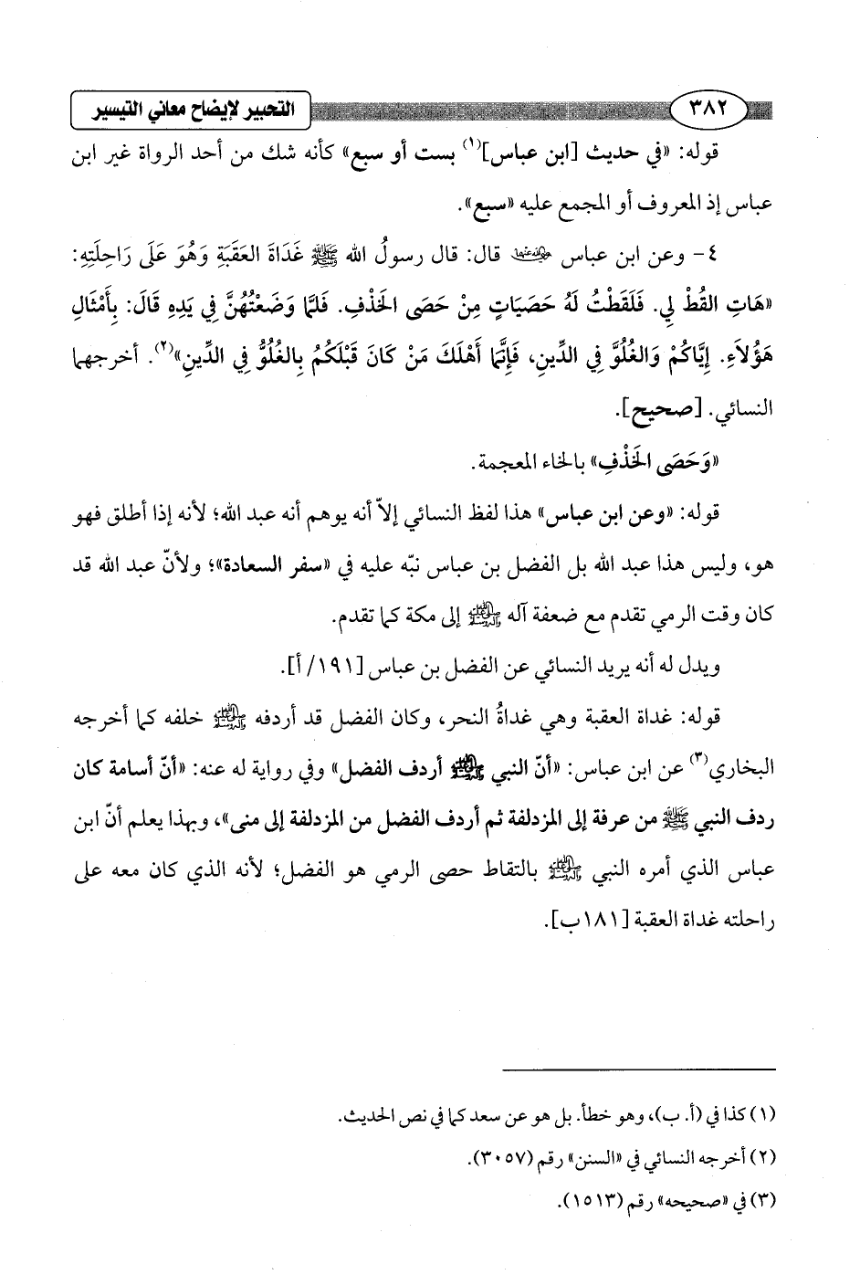 قوله: "وعن ابن عباس" هذا لفظ النسائي إلاّ أنه يوهم أنه عبد الله؛ لأنه إذا أطلق فهو هو، وليس هذا عبد الله بل الفضل بن عباس نبّه عليه في "سفر السعادة"؛ ولأنّ عبد الله قد كان وقت الرمي تقدم مع ضعفة آله - صلى الله عليه وسلم - إلى مكة كما تقدم.