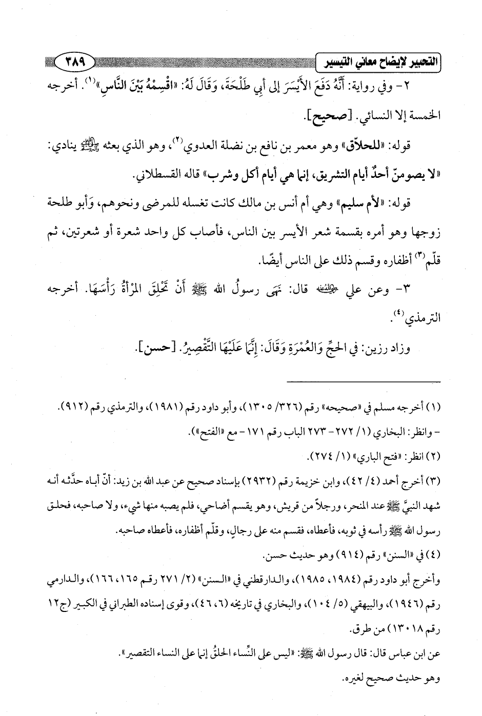 وزاد رزين: في الحجِّ وَالعُمْرَةِ وَقَالَ: إِنَّمَا عَلَيْهَا التَّقْصِيرُ. [حسن].