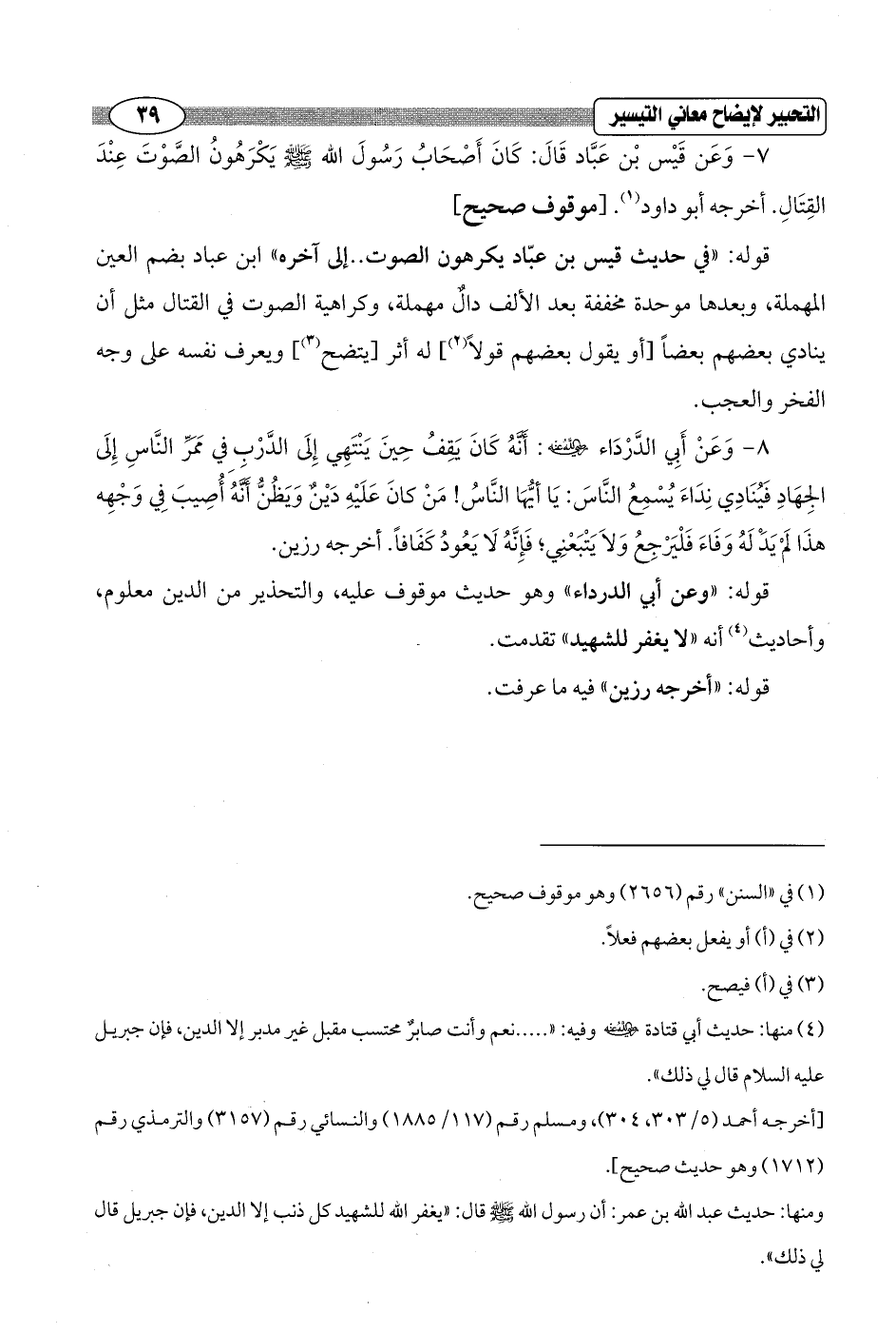 7 - وَعَن قَيْس بْن عَبَّاد قَالَ: كَانَ أَصْحَابُ رَسُولَ الله - صلى الله عليه وسلم - يَكْرَهُونُ الصَّوْتَ عِنْدَ القِتَالِ. أخرجه أبو داود (¬1). [موقوف صحيح]