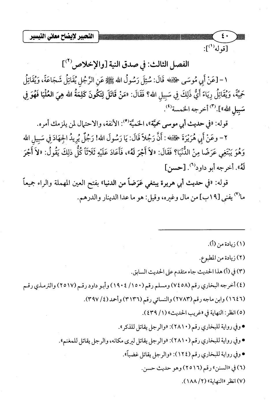 1 - [عَنْ أَبِي مُوسَى - رضي الله عنه - قَالَ: سُئِلَ رَسُولُ الله - صلى الله عليه وسلم - عَنِ الرَّجُلِ يُقَاتِلُ شَجَاعَةً، وَيُقَاتِلُ حَمِيَّةً، وَيُقَاتِلُ رِيَاءَّ أَيُّ ذَلِكَ فِي سَبِيلِ الله؟ فَقَالَ: "مَنْ قَاتَلَ لِتكُونَ كَلِمَةُ الله هِيَ العُلْيَا فَهُوَ فِي سَبِيلِ الله]. (¬3) أخرجه الخمسة (¬4).