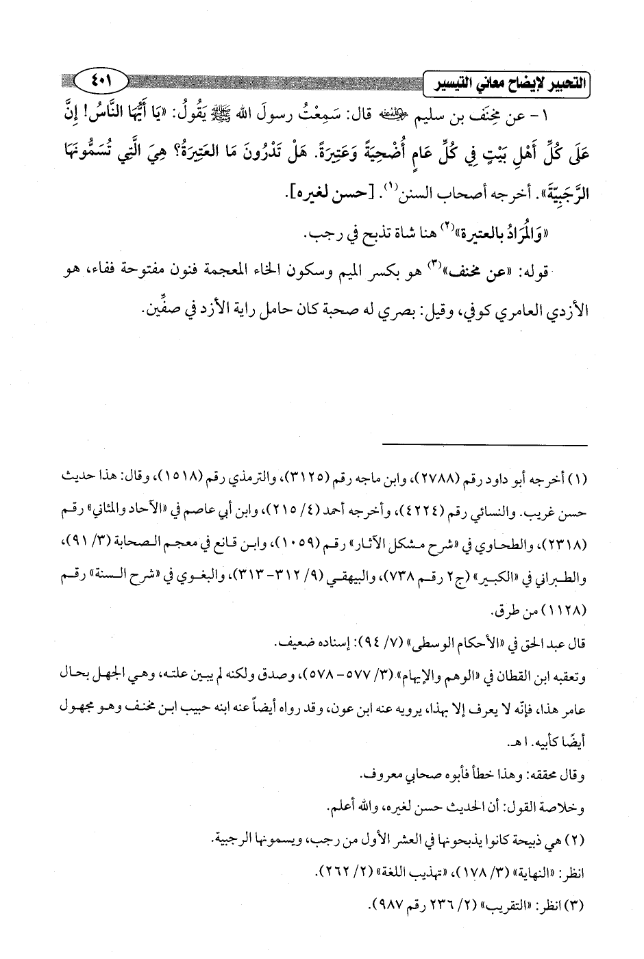 1 - عن مخِنَف بن سليم - رضي الله عنه - قال: سَمِعْتُ رسولَ الله - صلى الله عليه وسلم - يَقُولُ: "يَا أَيُّهَا النَّاسُ! إِنَّ عَلَى كُلِّ أَهْلِ بَيْتٍ فِي كُلِّ عَامٍ أُضْحِيَةً وَعَتِيرَةً. هَلْ تَدْرُونَ مَا العَتَيرَةُ؟ هِيَ الَّتِي تُسَمُّونَهَا الرَّجَبِيّةَ". أخرجه أصحاب السنن (¬1). [حسن لغيره].