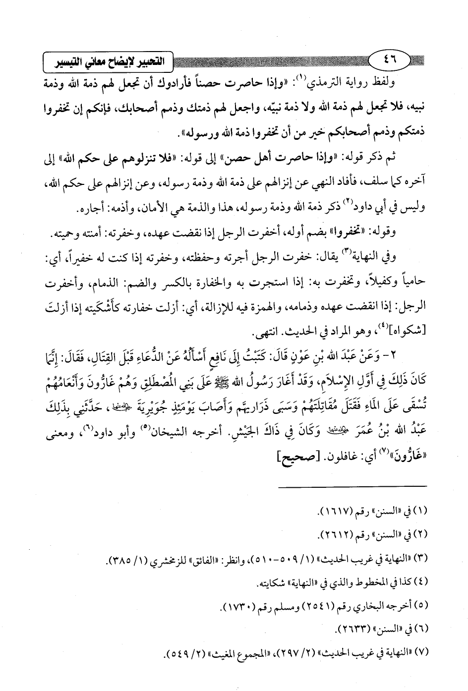وفي النهاية (¬3) يقال: خفرت الرجل أجرته وحفظته, وخفرته إذا كنت له خفيراً، أي: حامياً وكفيلاً، وتخفرت به: إذا استجرت به والخفارة بالكسر والضم: الذمام، وأخفرت الرجل: إذا انقضت عهده وذمامه، والهمزة فيه للإزالة، أي: أزلت خفارته كأَشْكَيته إذا أزلتَ [شكواه] (¬4)، وهو المراد في الحديث. انتهى.