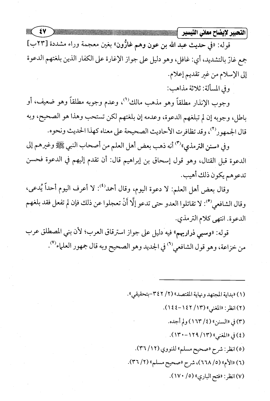 قوله: "في حديث عبد الله بن عون وهم غارُّون" بغين معجمة وراء مشددة [23 ب] جمع غارّ بالتشديد، أي: غافل، وهو دليل على جواز الإغارة على الكفار الذين بلغتهم الدعوة إلى الإسلام من غير تقديم إعلام.
