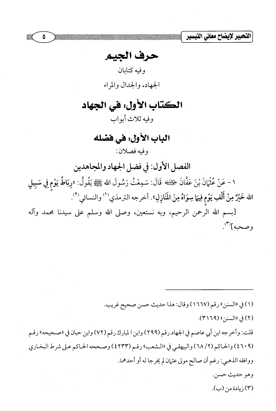 1 - عَنْ عُثْمَانَ بْنَ عَفَّانَ - رضي الله عنه - قَالَ: سَمِعْتُ رَسُولَ الله - صلى الله عليه وسلم - يَقُولُ: "رِبَاطُ يَوْمٍ فِي سَبِيلِ الله خَيْرٌ مِنْ أَلْفِ يَوْمٍ فِيمَا سِوَاهُ مِنَ المَنَازِلِ". أخرجه الترمذي (¬1) والنسائي (¬2).