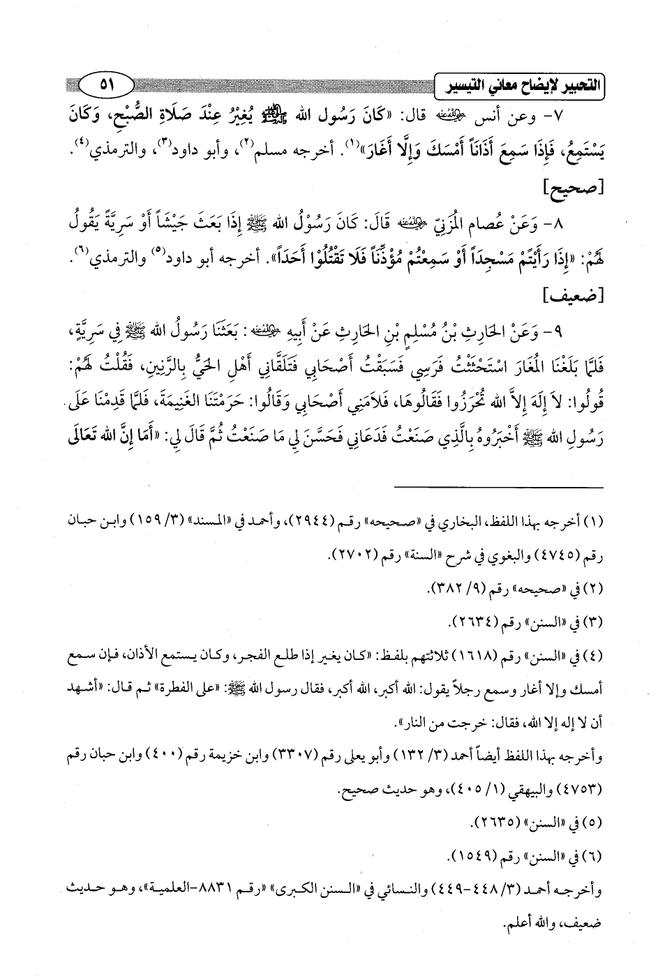 7 - وعن أنس - رضي الله عنه - قال. "كَانَ رَسُول الله- صلى الله عليه وسلم - يُغِيْرُ عِنْدَ صَلَاةِ الصُّبْحِ، وَكَانَ يَسْتَمِعُ، فَإِذَا سَمِعَ أَذَانَاً أَمْسَكَ وَإِلَّا أَغَارَ" (¬1). أخرجه مسلم (¬2)، وأبو داود (¬3)، والترمذي (¬4). [صحيح]