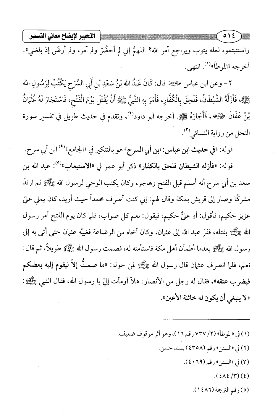 2 - وعن ابن عباس - رضي الله عنهما - قال: كَانَ عَبْدُ الله بْنُ سَعْدِ بْنِ أَبِي السَّرْحِ يَكْتُبُ لِرَسُول الله - صلى الله عليه وسلم -، فَأَزَلَّهُ الشَّيْطَانُ، فَلَحِقَ بِالْكُفَّارِ، فَأَمَرَ بِهِ النَّبيُّ - صلى الله عليه وسلم - أَنْ يُقْتَلَ يَوْمَ الْفَتْحِ، فَاسْتَجَارَ لَهُ عُثْمَانُ بْنُ عَفّانَ - رضي الله عنه -، فَأَجَارَهُ - صلى الله عليه وسلم -. أخرجه أبو داود (¬2)، وتقدم في حديث طويل في تفسير سورة النحل من رواية النسائي (¬3).