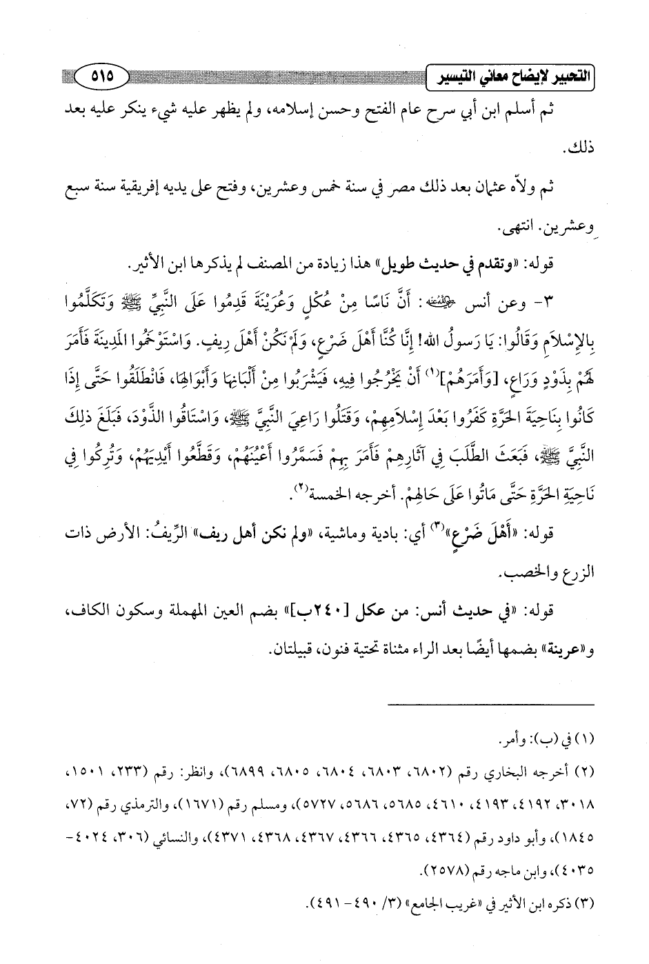 3 - وعن أنس - رضي الله عنه -: أَنَّ نَاسًا مِنْ عُكْلٍ وَعُرَيْنَةَ قَدِمُوا عَلَى النَّبِيِّ - صلى الله عليه وسلم - وَتَكَلَّمُوا بِالإِسْلاَمِ وَقَالُوا: يَا رَسولُ الله! إِنَّا كُنَّا أَهْلَ ضَرْعٍ، وَلمْ نَكُنْ أَهْلَ رِيفٍ. وَاسْتَوْخَمُوا المَدِينَةَ فَأَمَرَ لَهُمْ بِذَوْدٍ وَرَاعٍ، [وَأَمَرَهُمْ] (¬1) أَنْ يَخْرُجُوا فِيهِ، فَيَشْرَبُوا مِنْ أَلْبَانِهَا وَأَبْوَالِهَا، فَانْطَلَقُوا حَتَّى إِذَا كَانُوا بِنَاحِيَةَ الحَرَّةِ كَفَرُوا بَعْدَ إِسْلاَمِهِمْ، وَقَتَلُوا رَاعِيَ النَّبِيَّ - صلى الله عليه وسلم -، وَاسْتَاقُوا الذَّوْدَ فَبَلَغَ ذلِكَ النَّبِيَّ - صلى الله عليه وسلم -، فَبَعَثَ الطَّلَبَ في آثَارِهِمْ فَأَمَرَ بِهِمْ فَسَمَّرُوا أَعْيُنَهُمْ، وَقَطَّعُوا أَيْدِيَهُمْ، وَتُرِكُوا فِي نَاحِيَةِ الحَرَّةِ حَتَّى مَاتُوا عَلَى حَالهِمْ. أخرجه الخمسة (¬2).