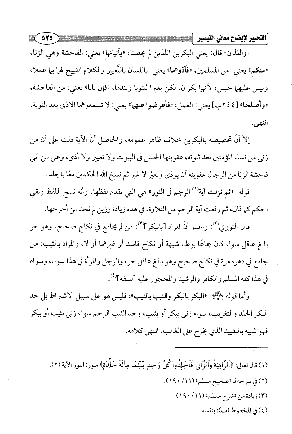إلاّ أنّ تخصيصه بالبكرين خلاف ظاهر عمومه، والحاصل أنّ الآية دلت على أن من زنى من نساء المؤمنين بعد ثبوته، عقوبتها الحبس في البيوت ولا تعيير ولا أذى، وعلى من أتى فاحشة الزنا من الرجال عقوبته أن يؤذى ويعير لا غير ثم نسخ الله الحكمين معًا بالجلد.