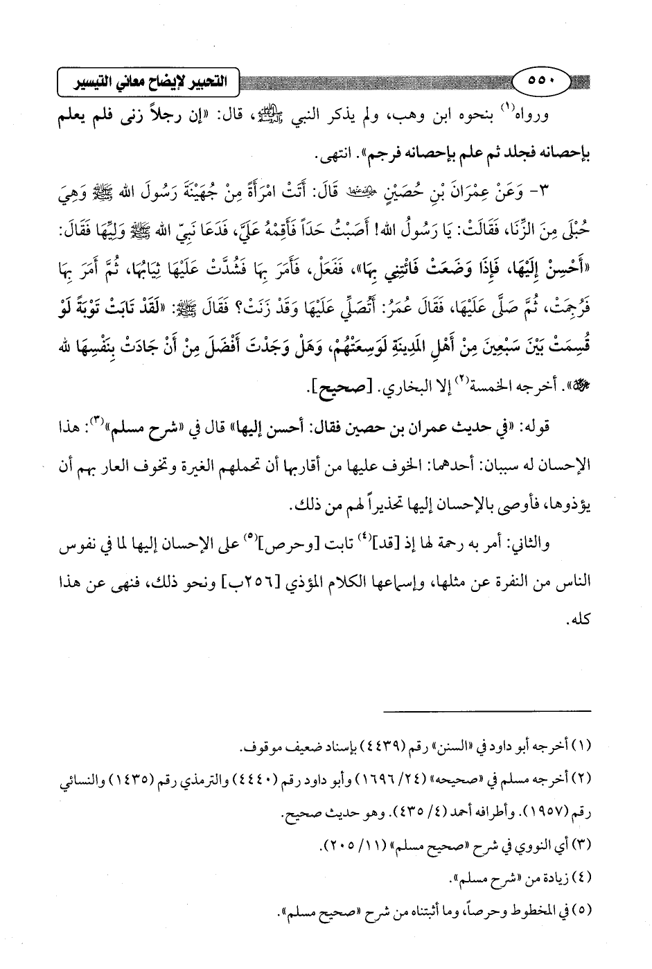 3 - وَعَنْ عِمْرَانَ بْنِ حُصَيْنٍ أنَّه - رضي الله عنه - قَالَ: أَتَتْ امْرَأَةً مِنْ جُهَيْنَةَ رَسُولَ الله - صلى الله عليه وسلم - وهِيَ حُبْلَى مِنَ الزِّنَا، فَقَالَتْ: يَا رَسُولُ الله! أَصَبْتُ حَدَاً فَأَقِمْهُ عَلَيَّ، فَدَعَا نَبِيّ الله - صلى الله عليه وسلم - وَلِيِّهَا فَقَالَ: "أَحْسِنْ إِلَيْهَا، فَإِذَا وَضَعَتْ فَائْتِني بِهَا"، فَفَعَلْ، فَأَمَرَ بِهَا فَشُدَّتْ عَلَيْهَا ثِيَابُهَا، ثُمَّ أَمَرَ بِهَا فَرُجِمَتْ، ثُمَّ صَلَّى عَلَيْهَا، فَقَالَ عُمَرُ: أتُصَلِّي عَلَيْهَا وَقَدْ زَنَتْ؟ فَقَالَ - صلى الله عليه وسلم -: "لَقَدْ تَابَتْ تَوْبَةً لَوْ قُسِمَتْ بَينَ سَبْعِينَ مِنْ أَهْلِ المَدِينَةِ لَوَسِعَتْهُمْ، وَهَلْ وَجَدْتَ أَفْضَلَ مِنْ أَنْ جَادَتْ بِنَفْسِهَا لله - عز وجل -". أخرجه الخمسة (¬2) إلا البخاري. [صحيح].