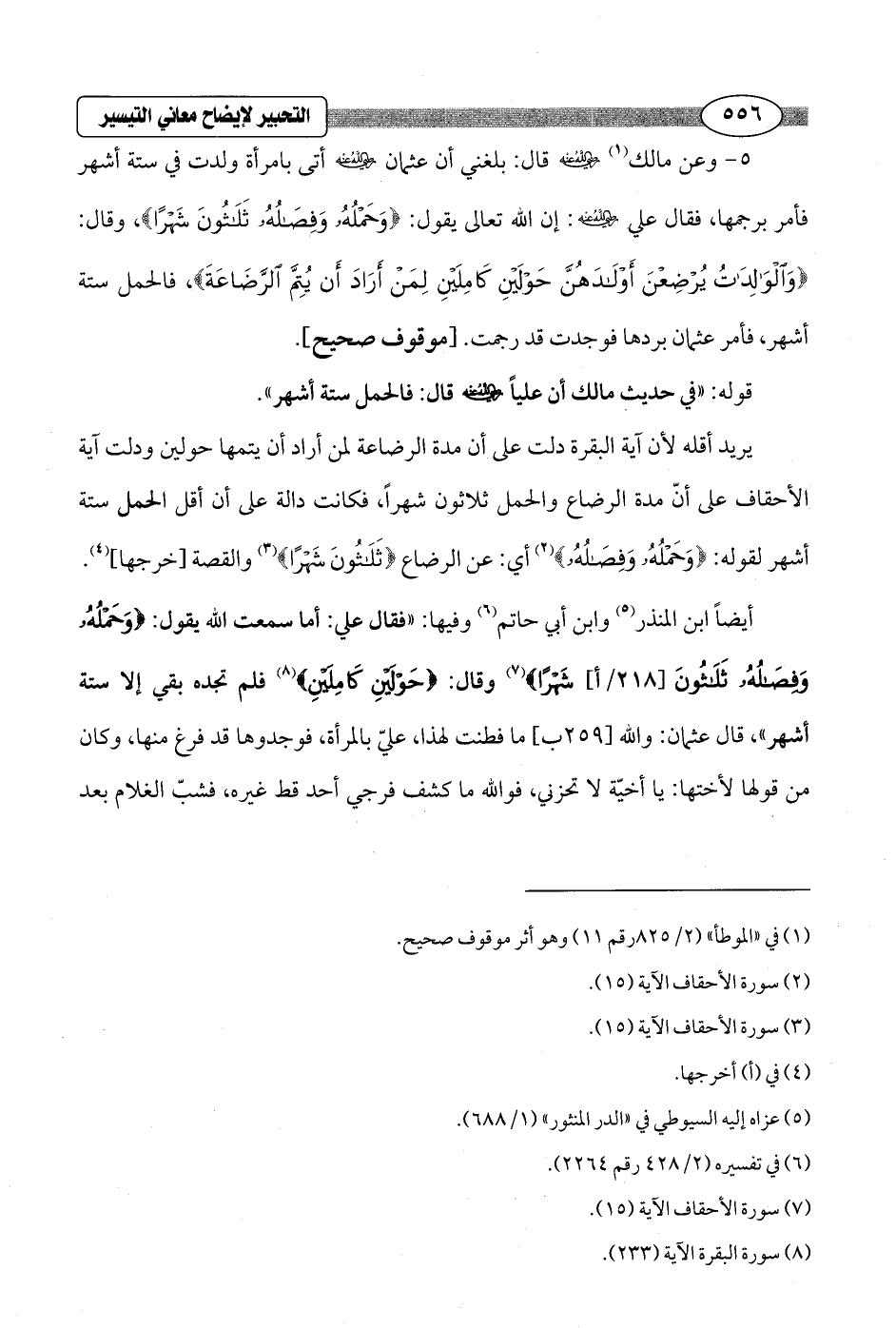 5 - وعن مالك (¬1) - رضي الله عنه - قال: بلغني أن عثمان - رضي الله عنه - أتى بامرأة ولدت في ستة أشهر فأمر برجمها، فقال علي - رضي الله عنه -: إن الله تعالى يقول: {وَحَمْلُهُ وَفِصَالُهُ ثَلَاثُونَ شَهْرًا} , وقال: {وَالْوَالِدَاتُ يُرْضِعْنَ أَوْلَادَهُنَّ حَوْلَيْنِ كَامِلَيْنِ لِمَنْ أَرَادَ أَنْ يُتِمَّ الرَّضَاعَةَ}، فالحمل ستة أشهر، فأمر عثمان بردها فوجدت قد رجمت. [موقوف صحيح].