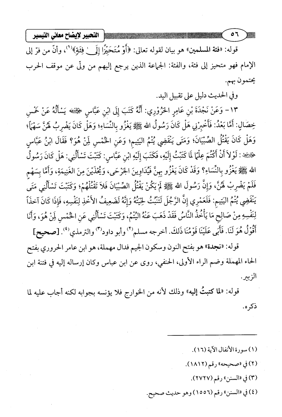 13 - وَعَنْ نَجْدَةَ بْنِ عَامِرٍ الحَرُوْرِي: أَنَّهُ كَتَبَ إِلَى ابْنِ عَبَّاسٍ - رضي الله عنه - يَسْأَلُهُ عَنْ خَمْسِ خِصَالٍ: أَمَّا بَعْدُ: فَأَخْبِرْنِي هَلْ كَانَ رَسُولُ الله - صلى الله عليه وسلم - يَغْزُو بِالنِّسَاءِ؛ وَهَلْ كَانَ يَضْرِبُ لَهُنَّ سَهْمَاً؛ وَهَلْ كَانَ يَقْتُلُ الصِّبْيَانَ؛ وَمَتَى يَنْقَضِي يُتْمُ اليَتِيمِ؛ وَعَنِ الخُمْسِ لِمَنْ هُوَ؟ فَقَالَ ابْنُ عَبَّاسٍ - رضي الله عنهما -: لَوْلاَ أَنْ أَكْتُمَ عِلْمًا لمَا كَتَبْتُ إِلَيْهِ، فَكَتَبَ إِلَيْهِ ابْنِ عَبَّاسٍ: كَتَبْتَ تَسْأَلُنِي: هَلْ كَانَ رَسُولُ الله - صلى الله عليه وسلم - يَغْزُو بِالنِّسَاءِ؟ وَقَدْ كَانَ يَغْزُو بِهِنَّ فَيُدَاوِينَ الجَرْحَى، وَيُحْذَيْنَ مِنَ الغَنِيمَةِ، وَأَمَّا بِسَهْمٍ فَلَمْ يَضْرِبْ لَهُنَّ، وَإِنَّ رَسُولَ الله - صلى الله عليه وسلم - لَمْ يَكُن يَقْتُلُ الصِّبْيَانَ فَلاَ تَقْتُلْهُمْ؛ وَكَتَبْتَ تَسْأَلُنِي مَتَى يَنْقَضِي يُتْمُ اليَتِيمِ: فَلَعَمْرِي إِنَّ الرَّجُلَ لَتَنْبُتُ لِحْيَتُهُ وَإنَّهُ لَضعِيفُ الأَخْذِ لِنَفْسِهِ، فَإِذَا كَانَ آخذَاً لِنَفْسِهِ مِنْ صَالِحِ مَا يَأْخُذُ النَّاسُ فَقَدْ ذَهَبَ عَنْهُ اليُتْمُ، وَكَتَبْتَ تَسْأَلنِي عَنِ الخُمْسِ لِمَنْ هُوَ، وَأَنَا أَقُوْلُ هُوَ لَنَا. فَأَبَى عَلَيْنَا قَوْمُنَا ذَلكَ. أخرجه مسلم (¬2) وأبو داود (¬3) والترمذي (¬4). [صحيح]