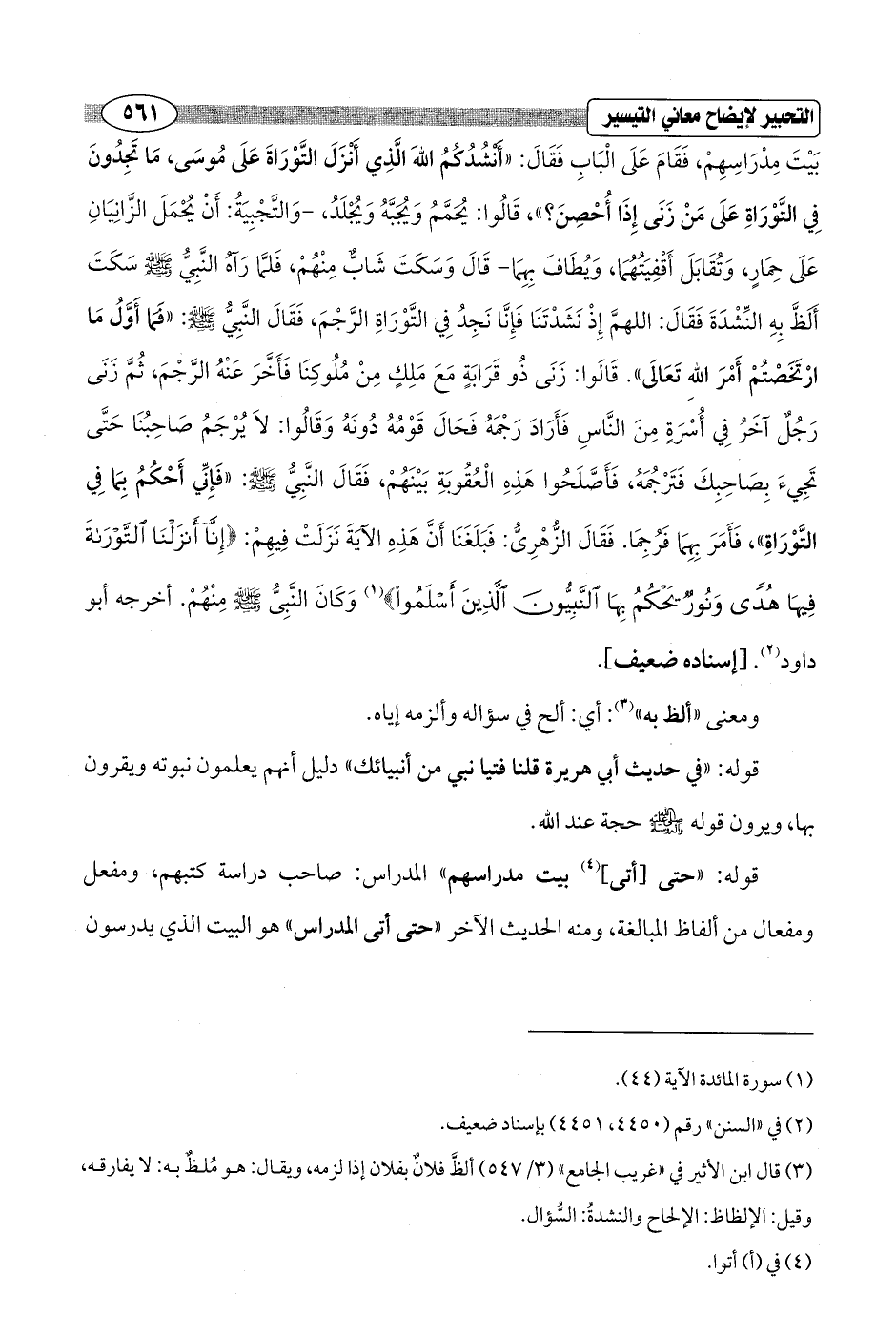 التَّوْرَاةِ"، فَأَمَرَ بِهِمَا فَرُجِمَا. فَقَالَ الزُّهْرِىُّ: فَبَلَغَنَا أَنَّ هَذِهِ الآيَةَ نَزَلَتْ فِيهِمْ: {إِنَّا أَنْزَلْنَا التَّوْرَاةَ فِيهَا هُدًى وَنُورٌ يَحْكُمُ بِهَا النَّبِيُّونَ الَّذِينَ أَسْلَمُوا} (¬1) وَكَانَ النَّبِيُّ - صلى الله عليه وسلم - مِنْهُمْ. أخرجه أبو داود (¬2). [إسناده ضعيف].