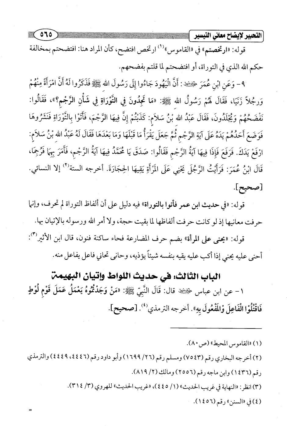 9 - وَعَنِ ابْنِ عُمَرَ - رضي الله عنهما -: أَنَّ الْيَهُودَ جَاءُوا إِلَى رَسُولَ اللهِ - صلى الله عليه وسلم - فَذَكَرُوا لَهُ أَنَّ امْرَأَةً مِنْهُمْ وَرجُلاً زَنَيَا، فَقَالَ لَهُمْ رَسُولُ اللهِ - صلى الله عليه وسلم -: "مَا تَجِدُونَ فِي التَّوْرَاةِ فِي شَأْنِ الرَّجْمِ؟ "، فَقَالُوا: نَفْضَحُهُمْ وَيُجْلَدُونَ، فَقَالَ عَبْدُ اللهِ بْنُ سَلاَمٍ: كَذَبْتُمْ إِنَّ فِيهَا الرَّجْمَ، فَأَتَوْا بِالتَّوْرَاةِ فَنَشَرُوهَا فَوَضَعَ أَحَدُهُمْ يَدَهُ عَلَى آيَةِ الرَّجْمِ ثُمَّ جَعَلَ يَقْرَأُ مَا قَبْلَهَا وَمَا بَعْدَهَا فَقَالَ لَهُ عَبْدُ اللهِ بْنُ سَلاَمٍ: ارْفَعْ يَدَكَ. فَرَفَعَ فَإِذَا فِيهَا آيَةُ الرَّجْمِ فَقَالُوا: صَدَقَ يَا مُحَمَّدُ فِيهَا آيَةُ الرَّجْمِ، فَأَمَرَ بِهِمَا فَرُجِمَا، قَالَ ابْنُ عُمَرَ: فَرَأَيْتُ الرَّجُلَ يَحْنِي عَلَى المَرْأَةِ يَقِيهَا الحِجَارَةَ. أخرجه الستة (¬2) إلا النسائي. [صحيح].
