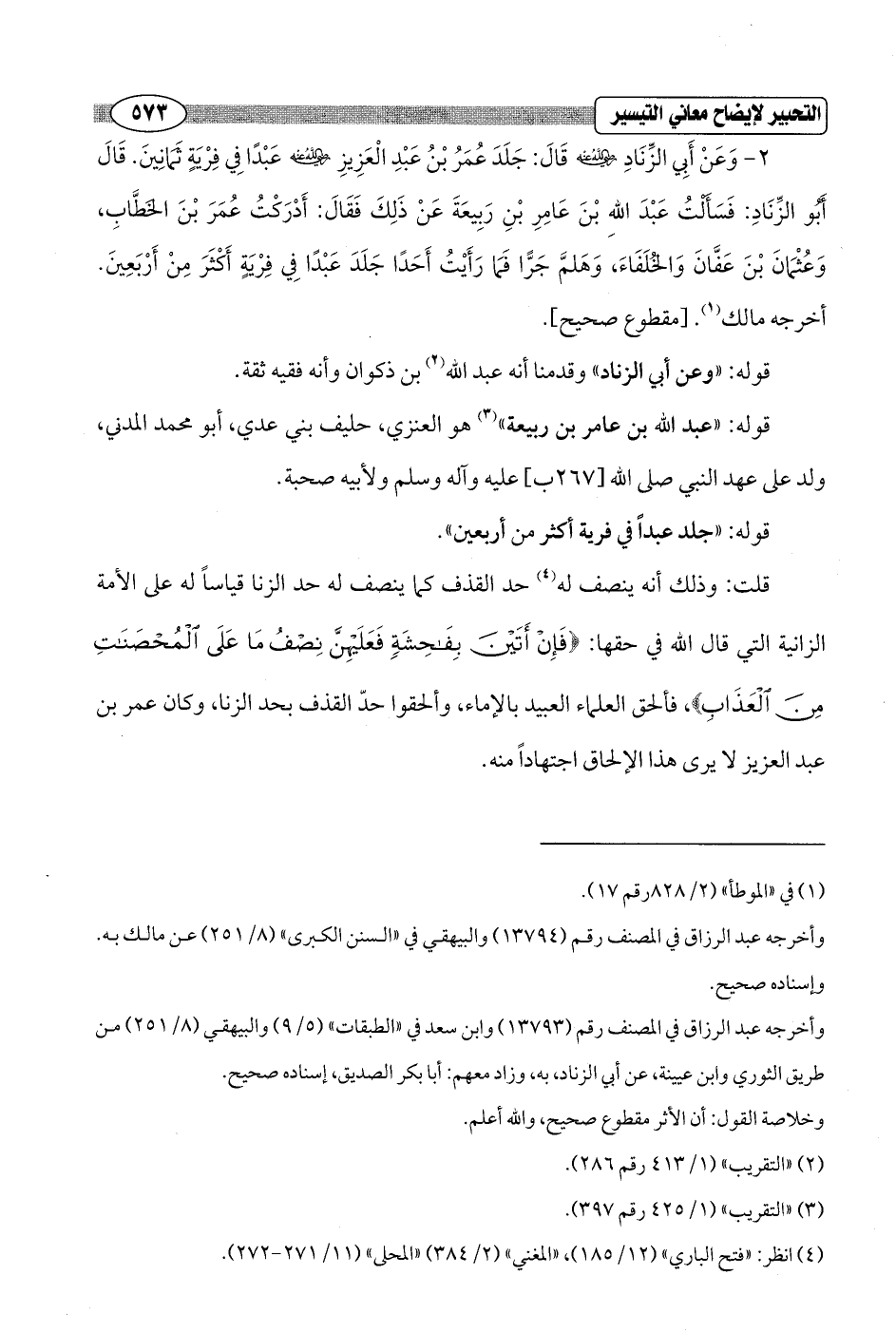 2 - وَعَنْ أَبِي الزِّنَادِ - رضي الله عنه - قَالَ: جَلَدَ عُمَرُ بْنُ عَبْدِ الْعَزِيزِ - رضي الله عنه - عَبْدًا فِي فِرْيَةٍ ثَمَانِينَ. قَالَ أَبُو الزِّنَادِ: فَسَأَلْتُ عَبْدَ اللهِ بْنَ عَامِرِ بْنِ رَبِيعَةَ عَنْ ذَلِكَ فَقَالَ: أَدْرَكْتُ عُمَرَ بْنَ الخَطَّابِ، وَعُثْمَانَ بْنَ عَفَّانَ وَالخُلَفَاءَ، وَهَلمَّ جَرًّا فَمَا رَأَيْتُ أَحَدًا جَلَدَ عَبْدًا فِي فِرْيَةٍ أَكْثَرَ مِنْ أَرْبَعَيِنَ. أخرجه مالك (¬1). [مقطوع صحيح].