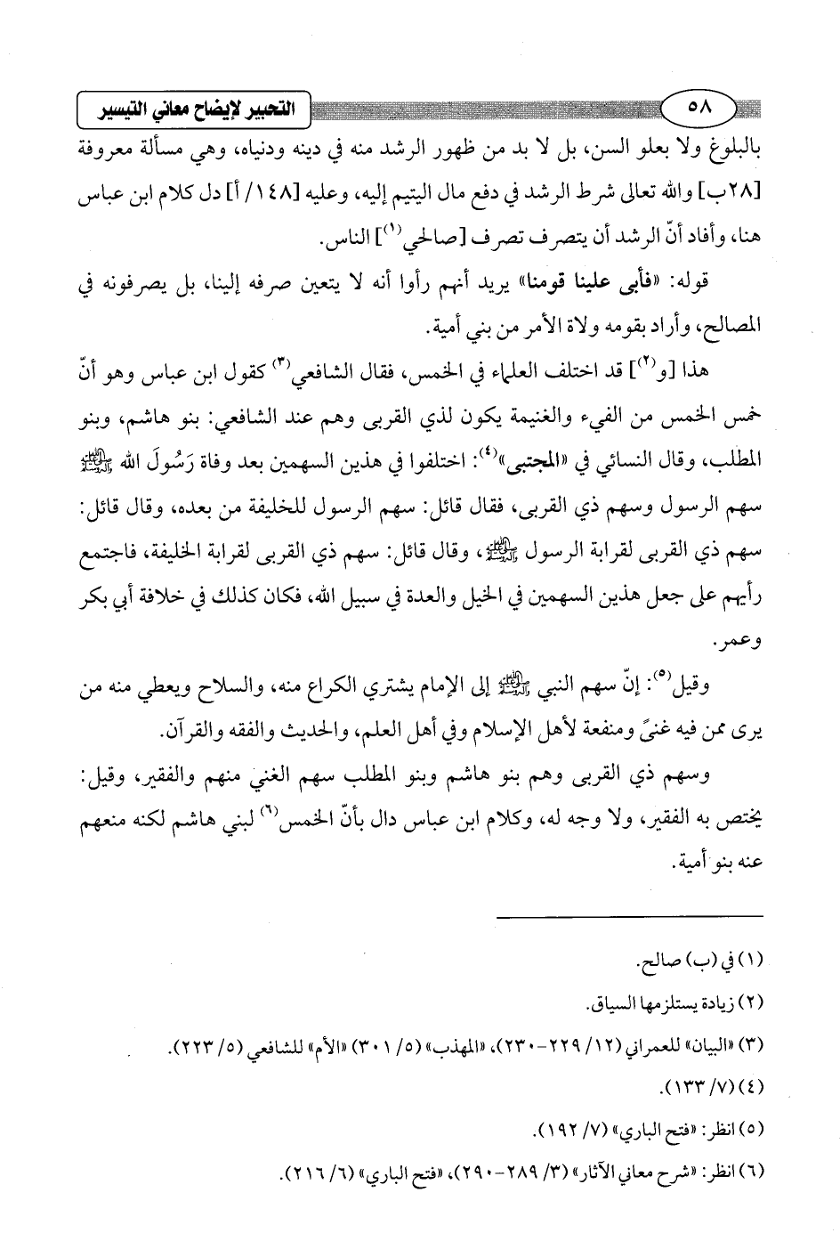 وسهم ذي القربى وهم بنو هاشم وبنو المطلب سهم الغني منهم والفقير، وقيل: يختص به الفقير، ولا وجه له، وكلام ابن عباس دال بأنّ الخمس (¬6) لبني هاشم لكنه منعهم عنه بنو أمية.