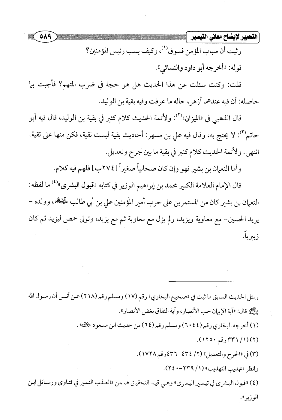 وأما النعمان بن بشير فهو وإن كان صحابياً صغيراً [274 ب] فلهم فيه كلام.