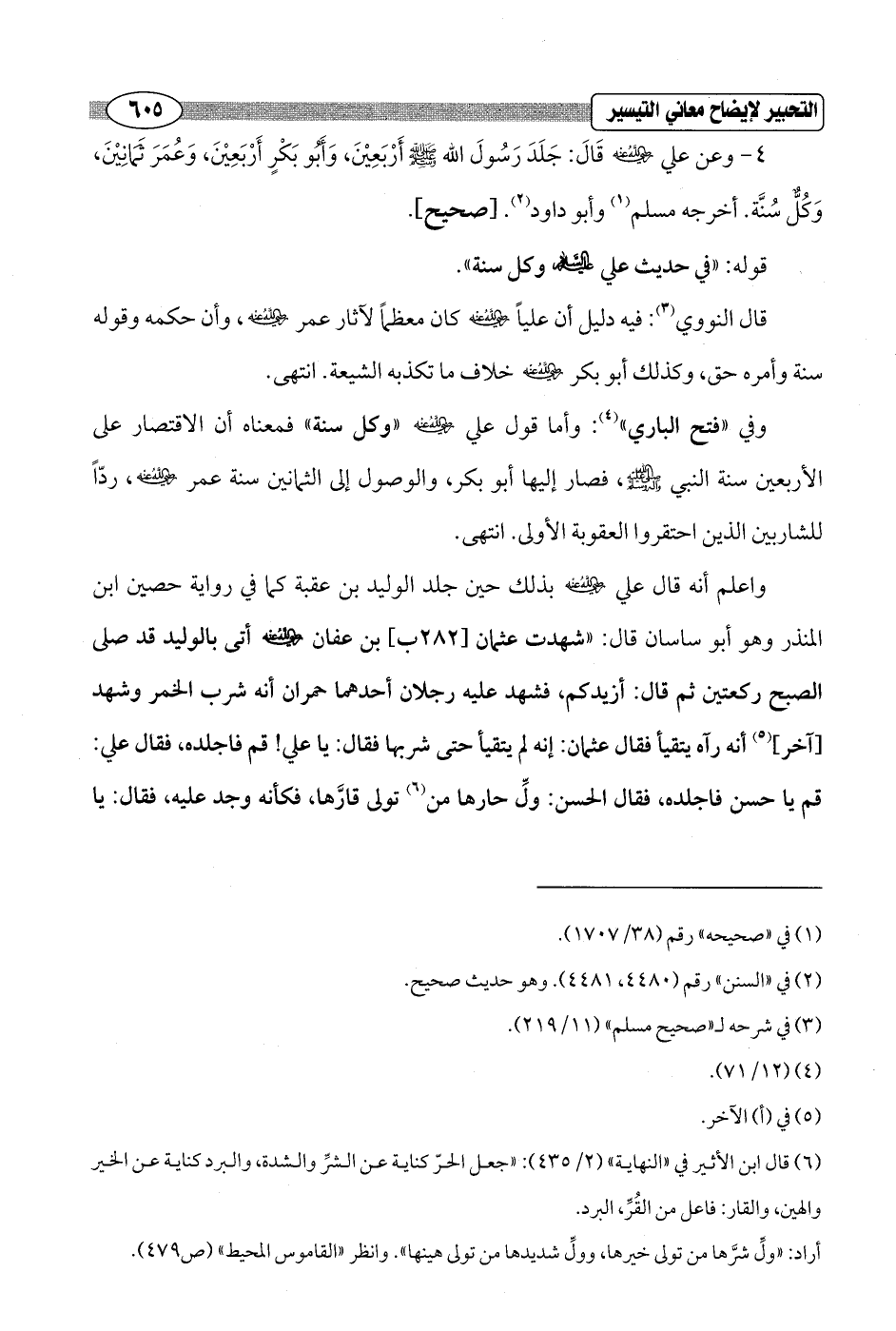 4 - وعن علي - رضي الله عنه - قَالَ: جَلَدَ رَسُولَ - صلى الله عليه وسلم - أَرْبَعِيْنَ، وَأَبُو بَكْرٍ أَرْبَعِيْنَ، وَعُمَرَ ثَمَانِيْنَ، وَكُلٌّ سُنَّة. أخرجه مسلم (¬1) وأبو داود (¬2). [صحيح].