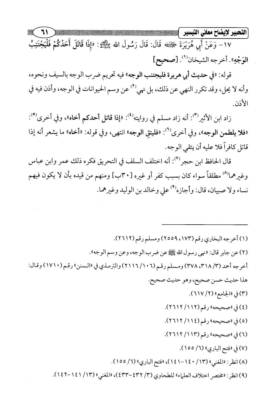 17 - وَعَنْ أَبِي هُرَيْرَةَ - رضي الله عنه - قَالَ: قَالَ رَسُولَ الله - صلى الله عليه وسلم -: "إِذَا قَاتَلَ أَحَدْكُمْ فَلْيَجْتَنِبُ الوَجْهِ". أخرجه الشيخان (¬1). [صحيح]