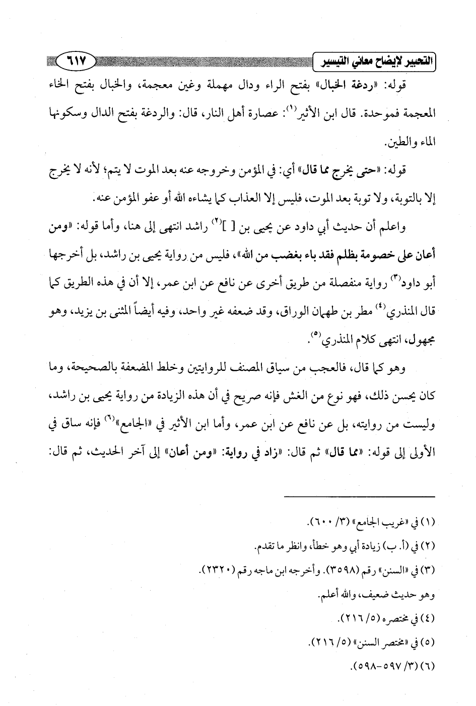 وهو كما قال، فالعجب من سياق المصنف للروايتين وخلط المضعفة بالصحيحة، وما كان يحسن ذلك، فهو نوع من الغش فإنه صريح في أن هذه الزيادة من رواية يحيى بن راشد، وليست من روايته، بل عن نافع عن ابن عمر، وأما ابن الأثير في "الجامع" (¬6) فإنه ساق في الأولى إلى قوله: "مما قال" ثم قال: "زاد في رواية: "ومن أعان" إلى آخر الحديث، ثم قال: