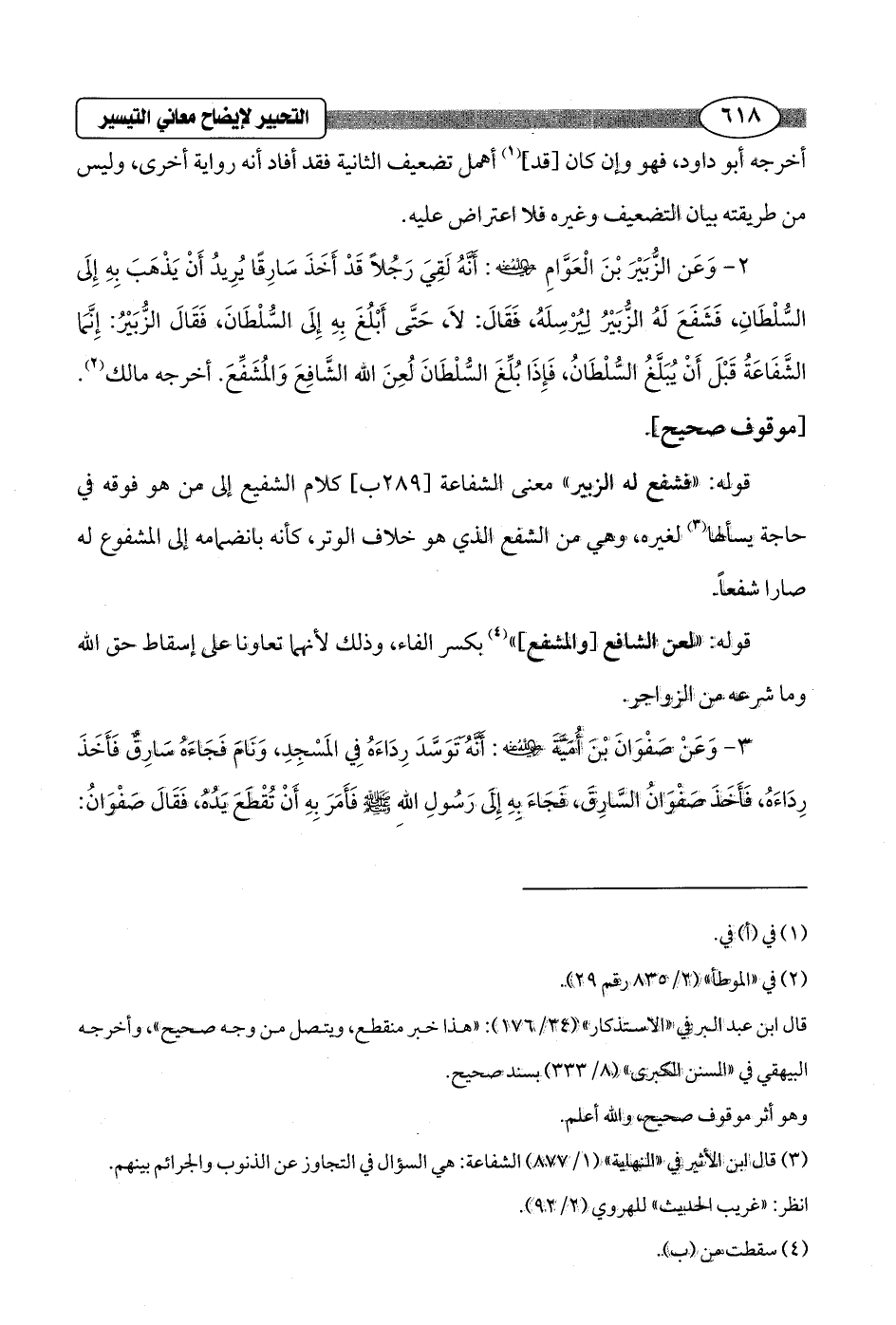 2 - وَعَن الزُّبَيْرَ بْنَ الْعَوَّامِ - رضي الله عنه -: أَنَّهُ لَقِيَ رَجلاً قَدْ أَخَذَ سَارِقًا يُرِيدُ أَنْ يَذْهَبَ بِهِ إِلَى السُّلْطَانِ فَشَفَعَ لَهُ الزُّبَيْرُ لِيُرْسِلَهُ, فَقَالَ: لاَ، حَتَّى أَبْلُغَ بِهِ إِلَى السُّلْطَانَ، فَقَالَ الزُّبَيْرُ: إِنَّمَا الشَّفَاعَةُ قَبْلَ أَنْ يُبَلَّغُ السُّلْطَانُ، فَإِذَا بُلِّغَ السُّلْطَانَ لعِنَ الله الشَّافِعَ وَالمُشَفِّعَ. أخرجه مالك (¬2). [موقوف صحيح].