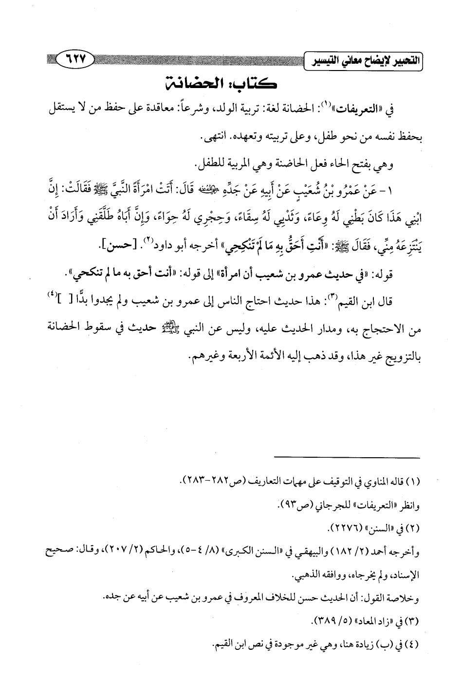قال ابن القيم (¬3): هذا حديث احتاج الناس إلى عمرو بن شعيب ولم يجدوا بدًّا [] (¬4) من الاحتجاج به، ومدار الحديث عليه، وليس عن النبي - صلى الله عليه وسلم - حديث في سقوط الحضانة بالتزويج غير هذا، وقد ذهب إليه الأئمة الأربعة وغيرهم.