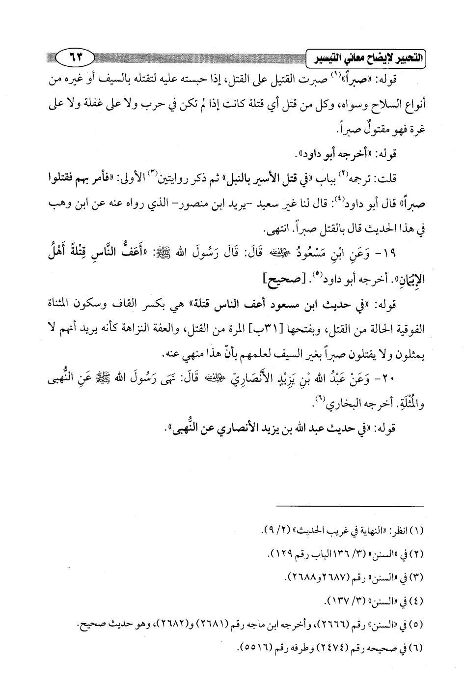 قلت: ترجمه (¬2) بباب "في قتل الأسير بالنبل" ثم ذكر روايتين (¬3) الأولى: "فأمر بهم فقتلوا صبراً" قال أبو داود (¬4): قال لنا غير سعيد - يريد ابن منصور - الذي رواه عنه عن ابن وهب في هذا الحديث قال بالقتل صبراً. انتهى.